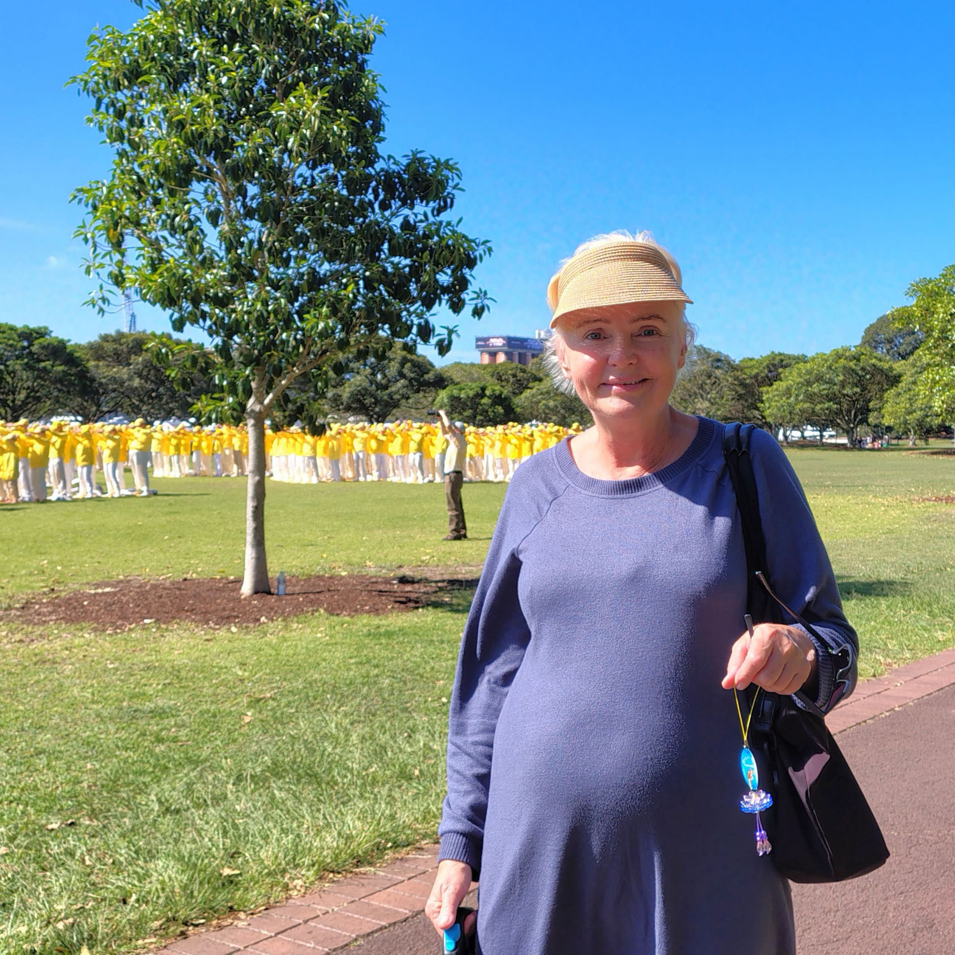活动当天,来自波兰、在澳洲生活了四十年的巴西亚·梅(Basia May)路过公园的排字现场,感佩真、善、忍理念能给人带来真正的幸福。