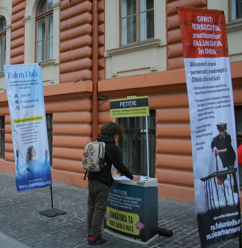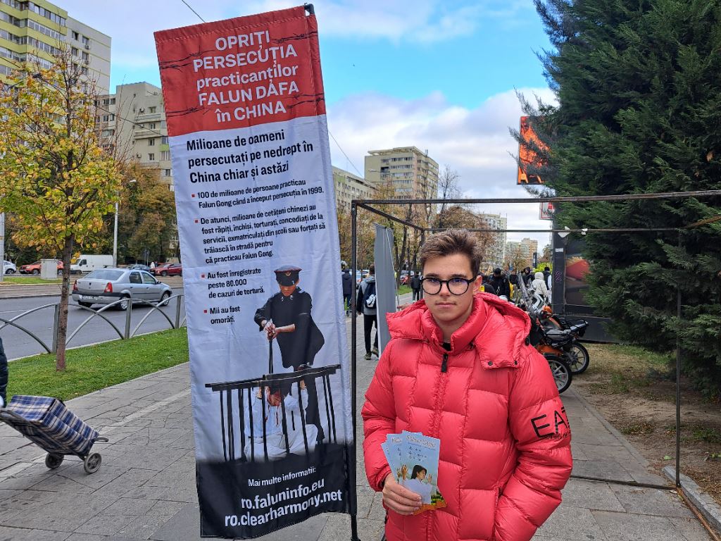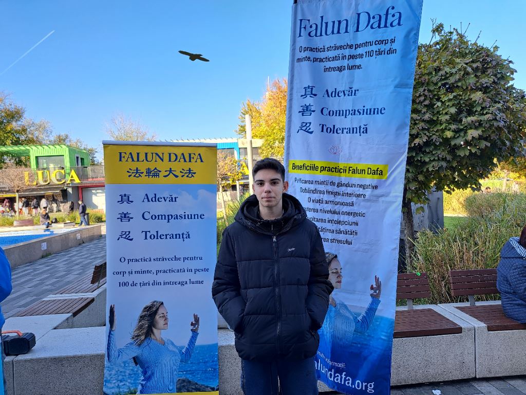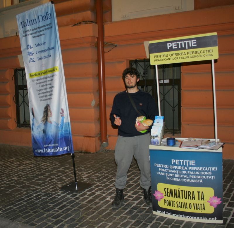 十一月九日,来自特尔古久(Târgu Jiu)的十九岁高中毕业生埃科比西·丹·塞巴斯蒂安(Ecobici Dan Sebastian)对法轮功学员举行的活动表示关注,因为与中共侵犯人权有关,就主动上前了解情况。