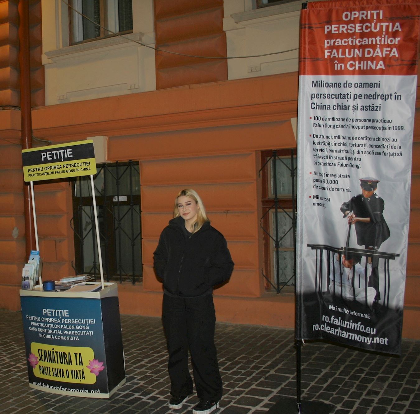 住在布拉索夫的安娜·玛丽亚·安巴鲁斯(Ana-Maria Ambarus)是一位内容审核员,十一月九日,她路过展位被法轮功学员展示的信息所吸引。她说:“展位上方的文字相当有意义,让我立刻想要了解全部内容,并促使我提供帮助,为这件事做出贡献。”