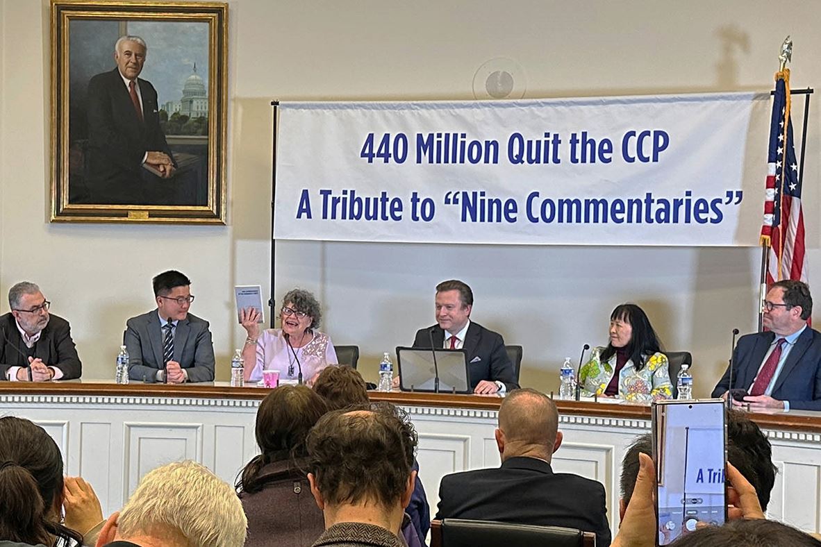 ·九·评*》二十周年研讨会上发言。'>图9:二零二四年十一月二十二日,法轮大法信息中心副主任刘宁平(Larry Liu) (右一)在美国国会众议院举行的《·九·评*》二十周年研讨会上发言。 |