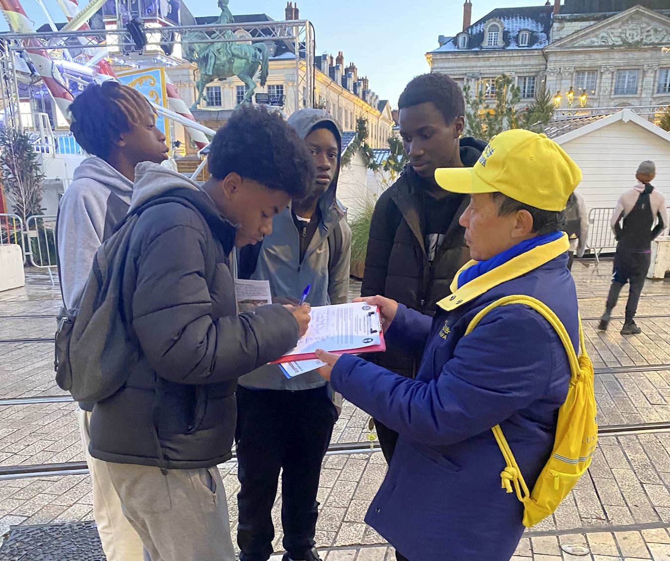 欧文(Owen)和他的朋友都是高中生。在放学回家的路上,他们遇到了法轮功。他们一行都签署了请愿书,要求停止对法轮功修炼者的强摘器官罪行。大家一致认为,政府竟然可以因为百姓修炼一种身心健康的方法而迫害自己的人民,这实在是很不正常。他们谴责中共对中国人基本权利的侵犯,并强调这与法国人所珍视的自由形成了鲜明的对比。