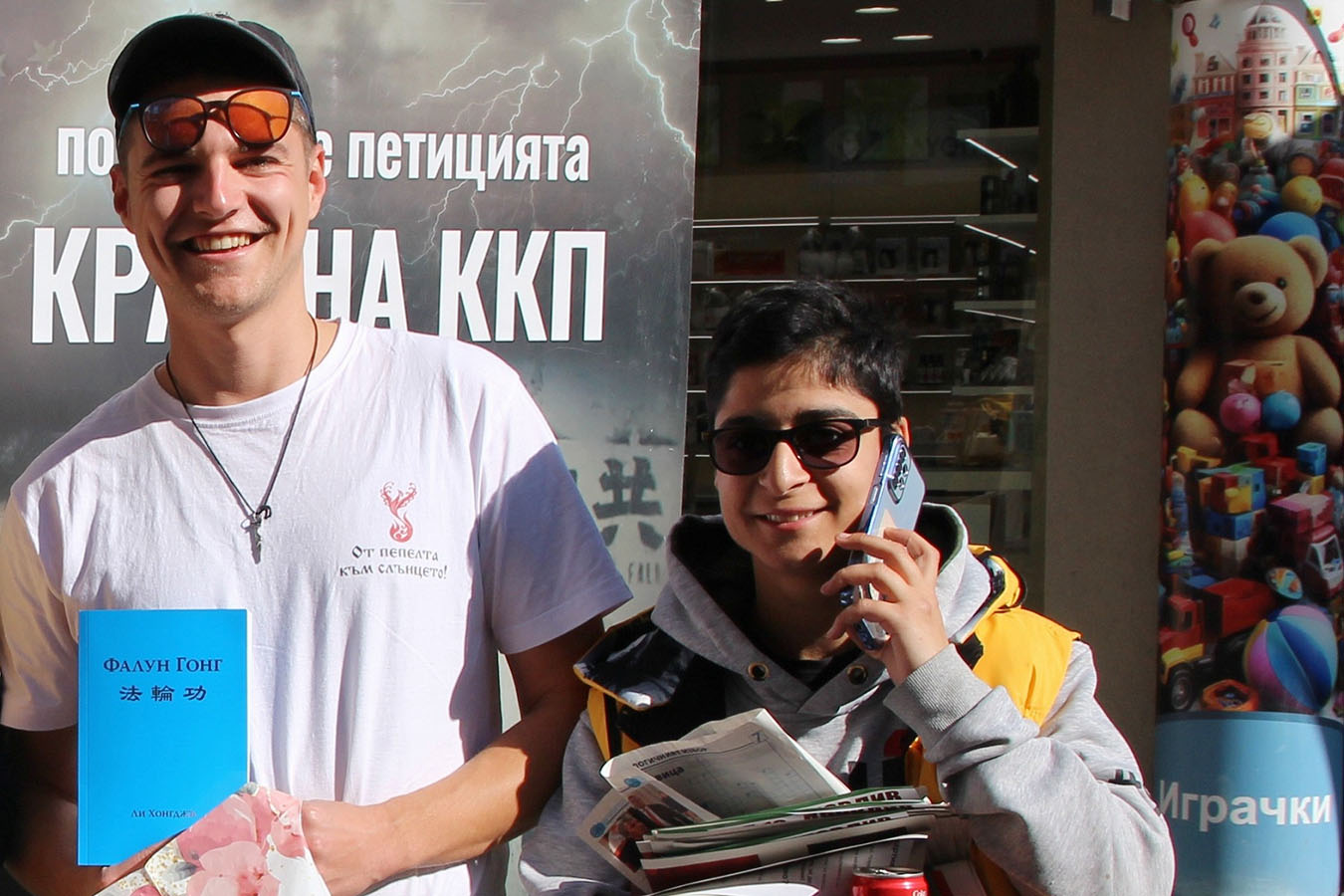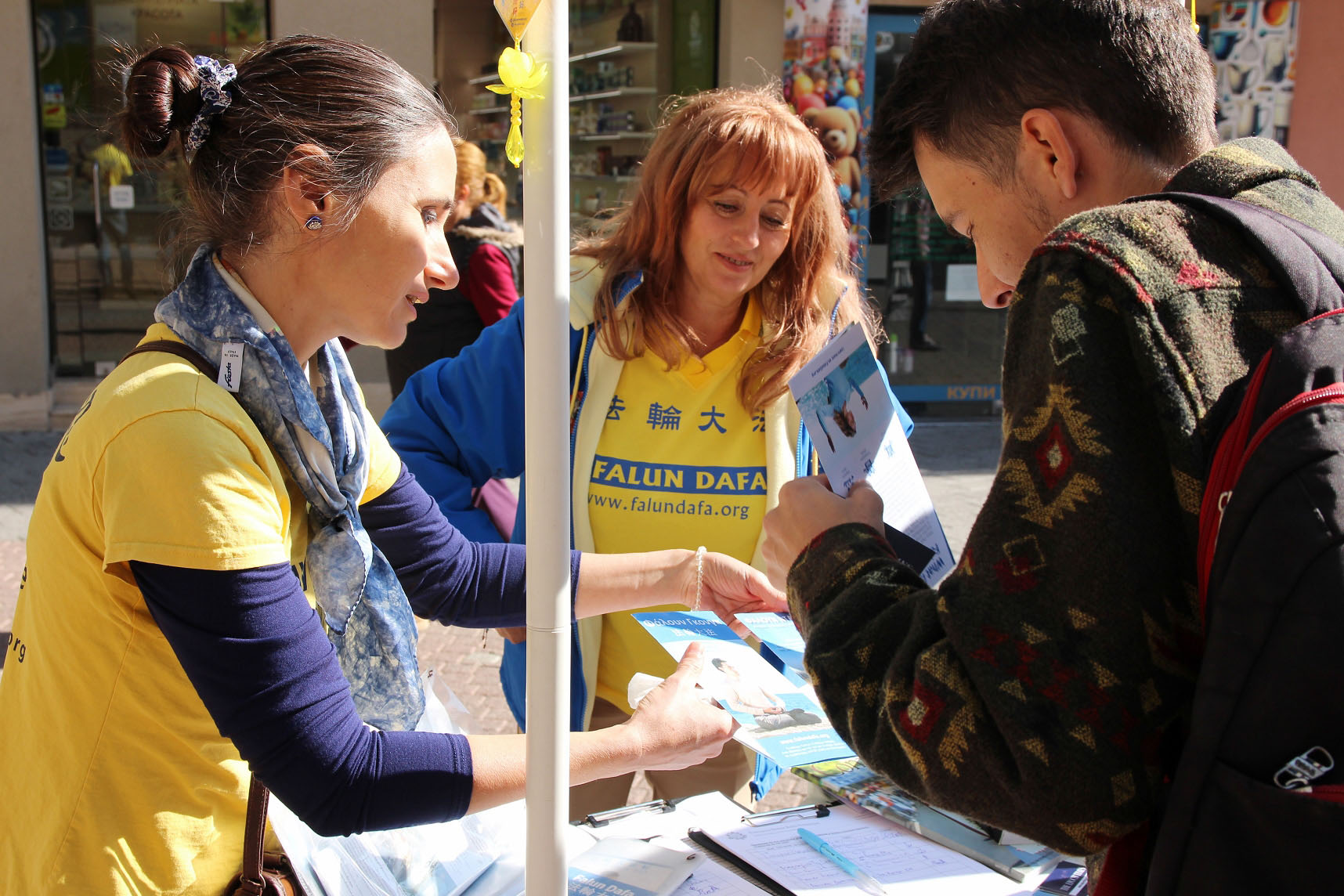 两位年轻男子好奇地走近真相展位,其中一位来自多布里奇(Dobrich)的人看到是法轮大法,立即请购了一本书。他表示,父亲长期罹患麻风病,一直想通过炼法轮功来改善身心健康。年轻人高兴地表示,终于买到书了,这书中包含着修炼和炼功的道理。