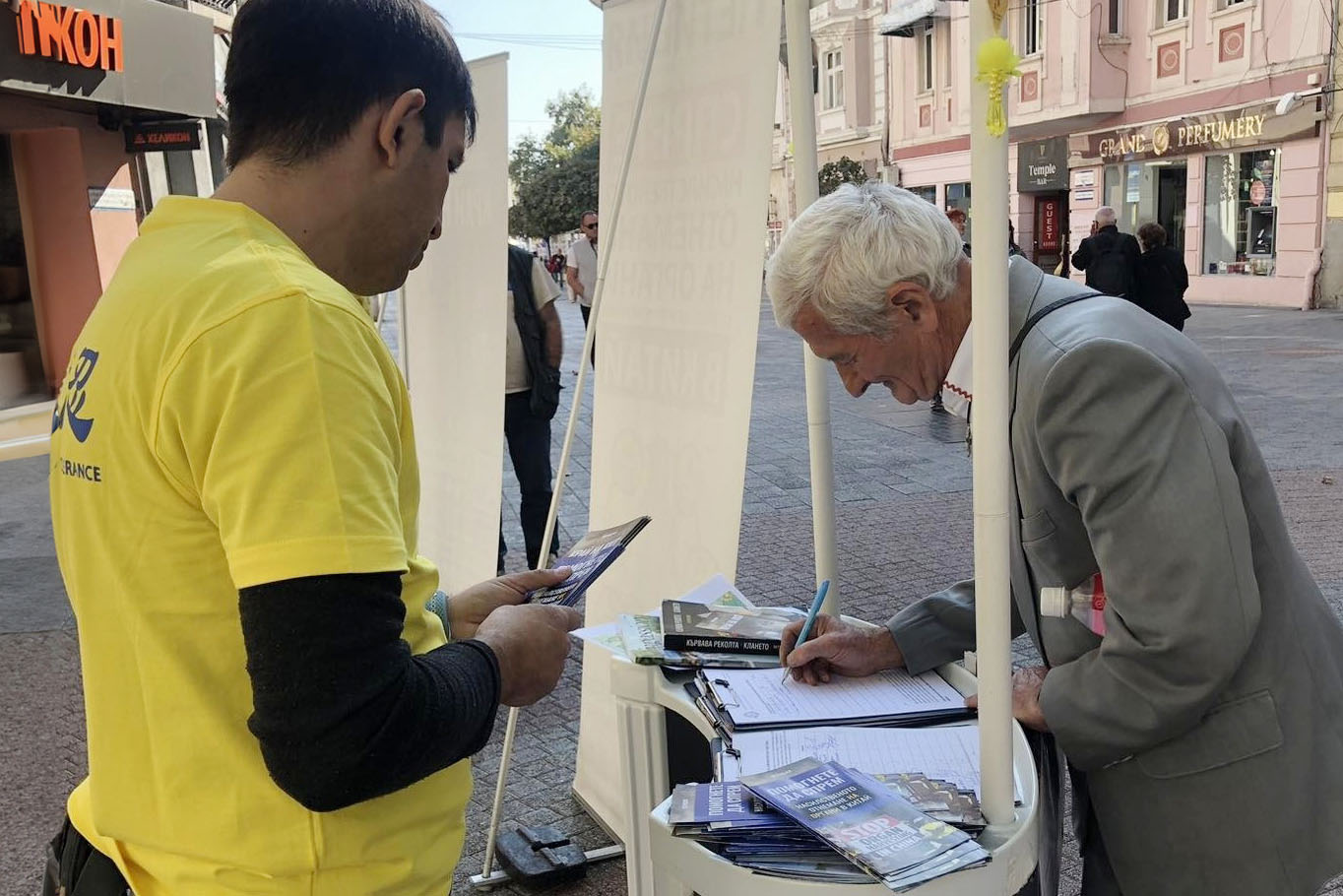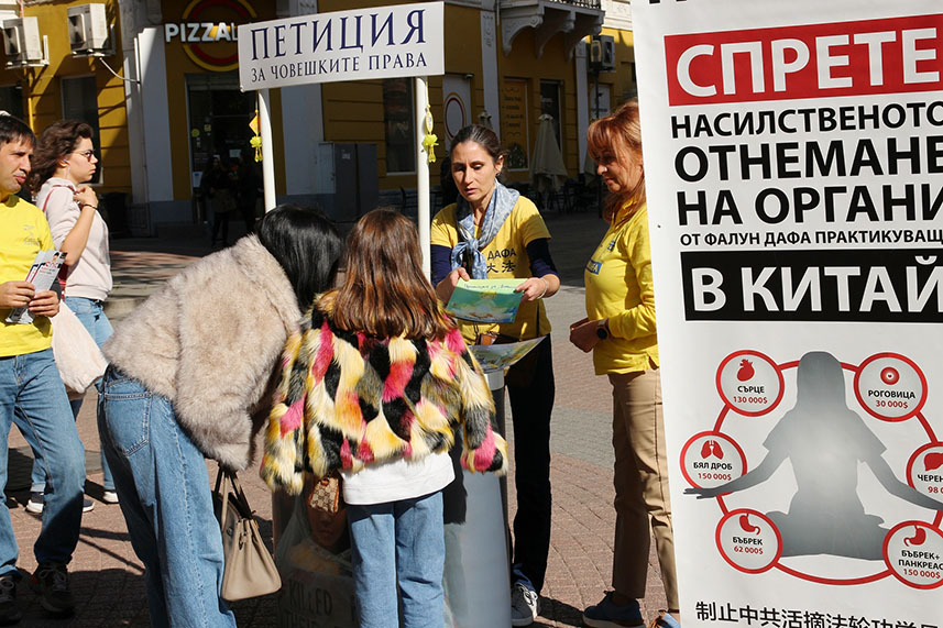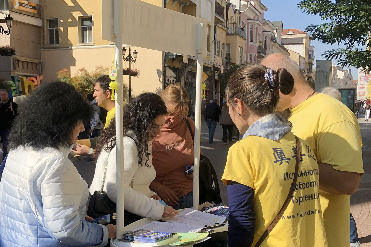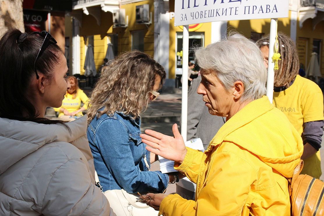 十月二十五日(星期五)是保加利亚议会选举前的“反思日(day of reflection)”,来自普罗夫迪夫、切佩拉雷(Chepelare)和佩什泰拉(Peshtera)的学员们在卡梅尼察楼梯对面繁忙的步行街上向民众发放传单,告诉大家中共对法轮功学员的迫害已经持续了二十五年。路人被身着黄衫白裤的法轮功学员所吸引,纷纷上前了解真相。
