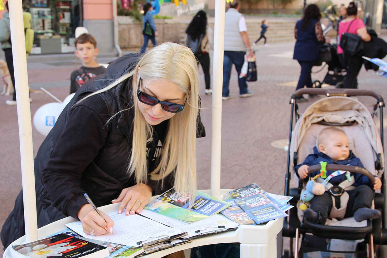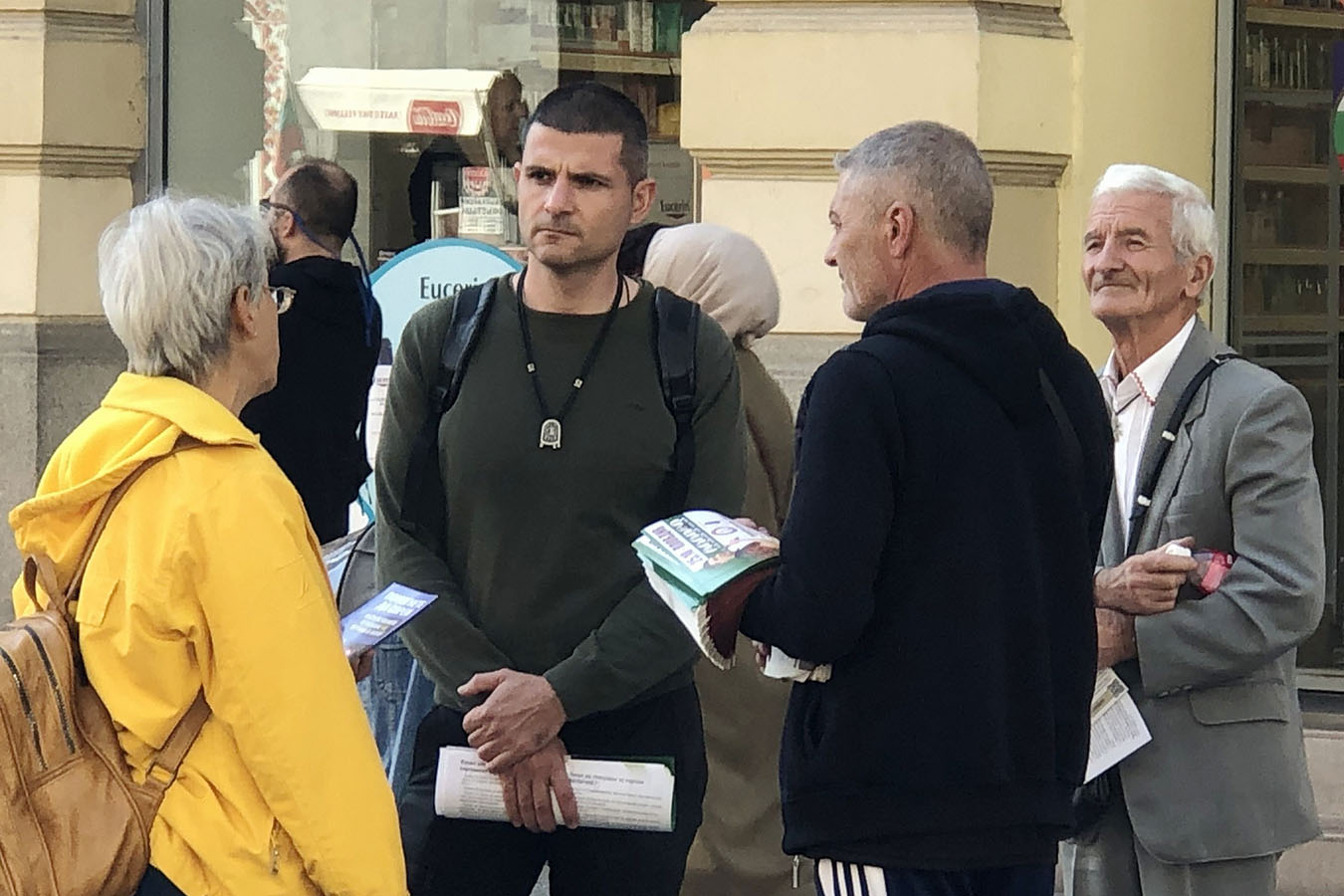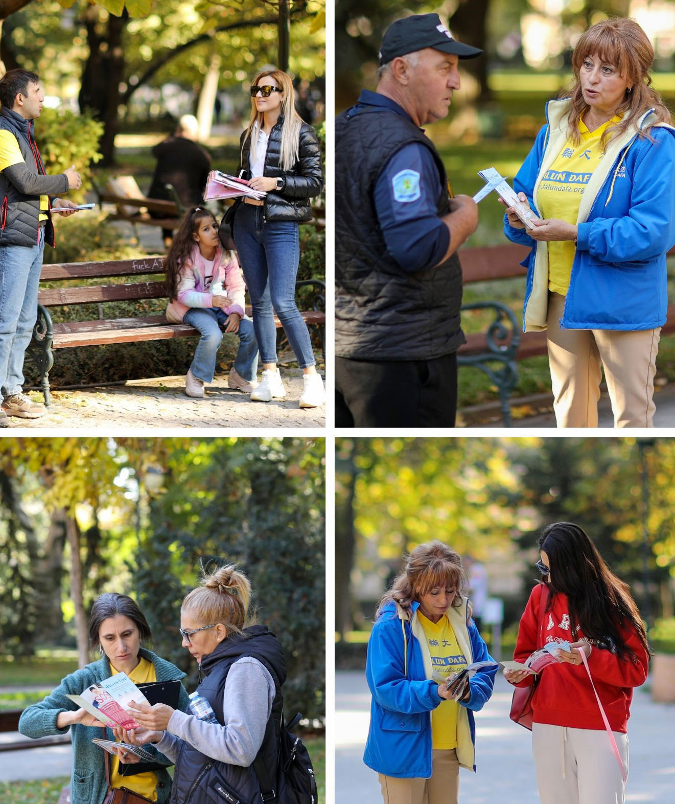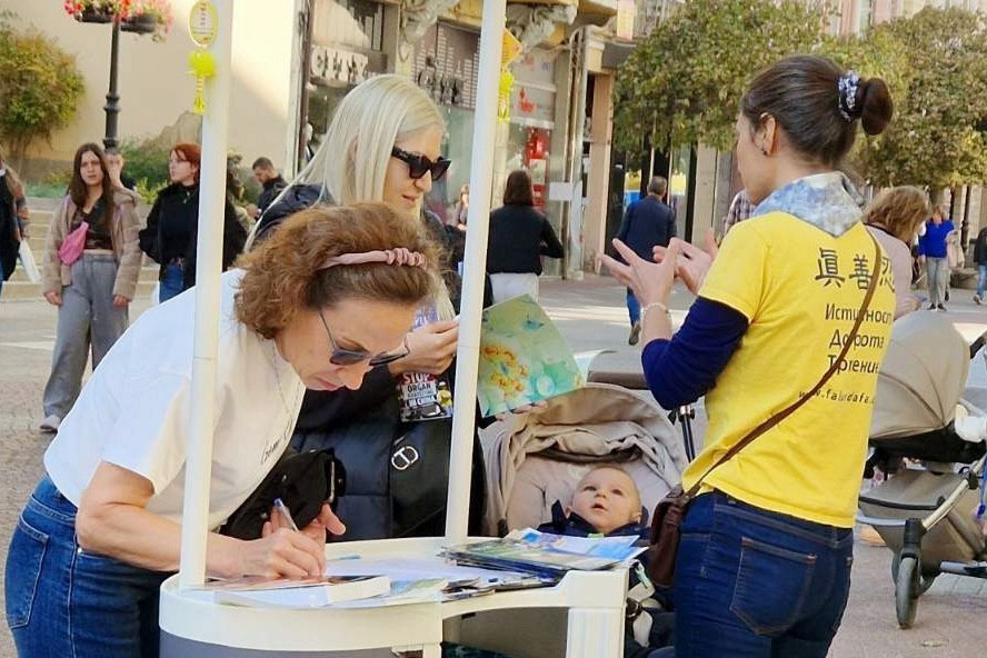 十月二十五日(星期五)是保加利亚议会选举前的“反思日(day of reflection)”,来自普罗夫迪夫、切佩拉雷(Chepelare)和佩什泰拉(Peshtera)的学员们在卡梅尼察楼梯对面繁忙的步行街上向民众发放传单,告诉大家中共对法轮功学员的迫害已经持续了二十五年。路人被身着黄衫白裤的法轮功学员所吸引,纷纷上前了解真相。