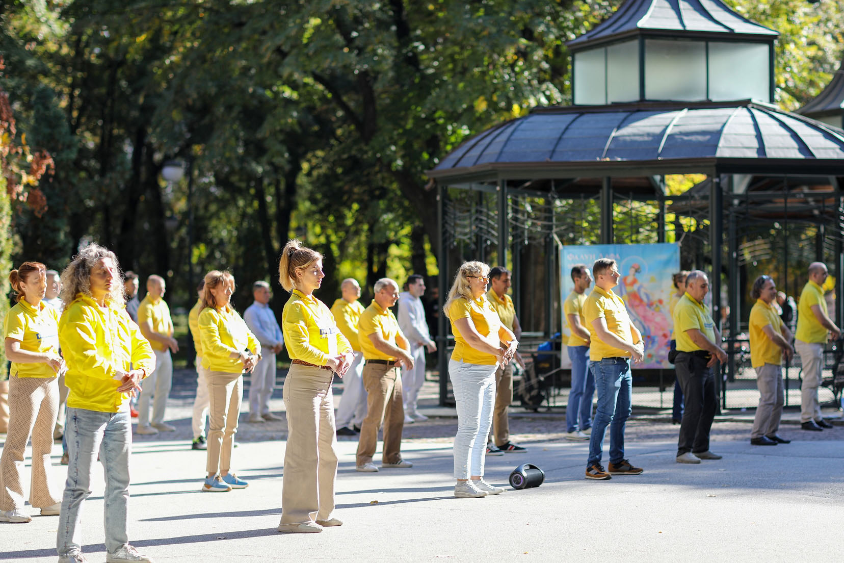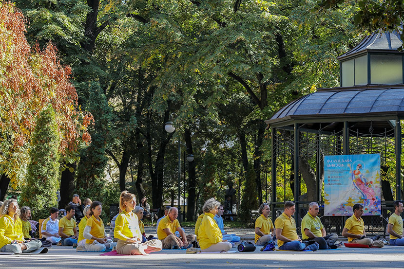 十月二十六日,星期六,来自保加利亚各地的法轮功学员在城市花园中心的罗马馆(Roman Pavilion)举行集体炼功。在平和轻柔的音乐中,吸引路过的民众驻足观看着,许多人被眼前宁静祥和的景象所震撼。