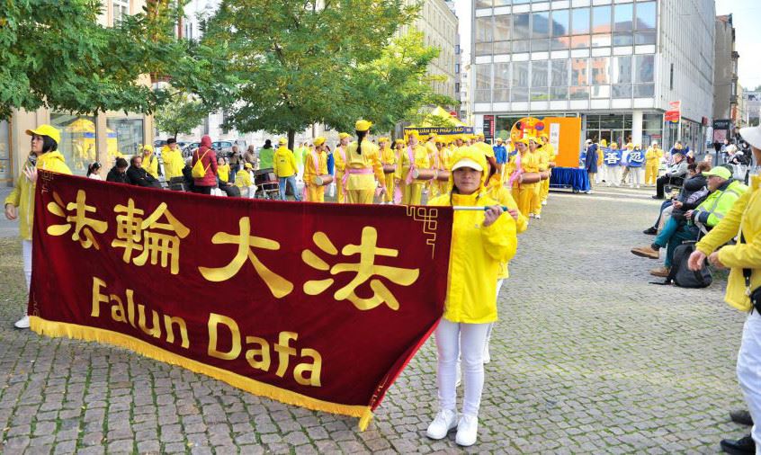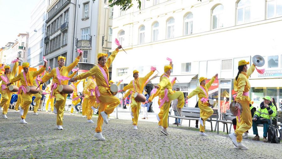 游行队伍经过了布尔诺市的主要景点,包括自由广场、摩拉维亚广场和蔬菜市场。游行队伍的最前方是法轮大法横幅,随后是腰鼓队、身穿仙女服的学员们,以及舞龙队。游行当天阳光明媚,街道上人来人往,不少市民驻足观看,许多人拍照记录这场别具特色的游行活动。