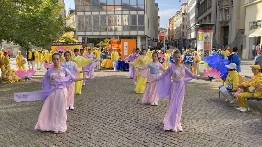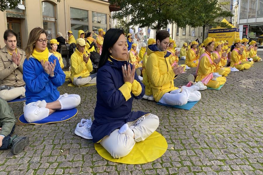 十月十八日星期五,也就是心得交流会的前一天,法轮大法学员们聚集在布尔诺的马林诺夫斯基广场,举办了一场庆祝活动,向公众介绍法轮大法。在游行开始前,学员们展示了法轮大法的功法,并发放了讲真相资料,向人们介绍法轮大法的修炼方法及其在中国受到中共迫害的情况。