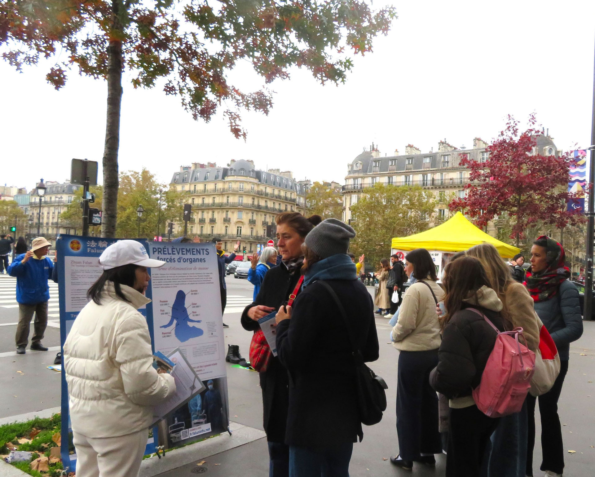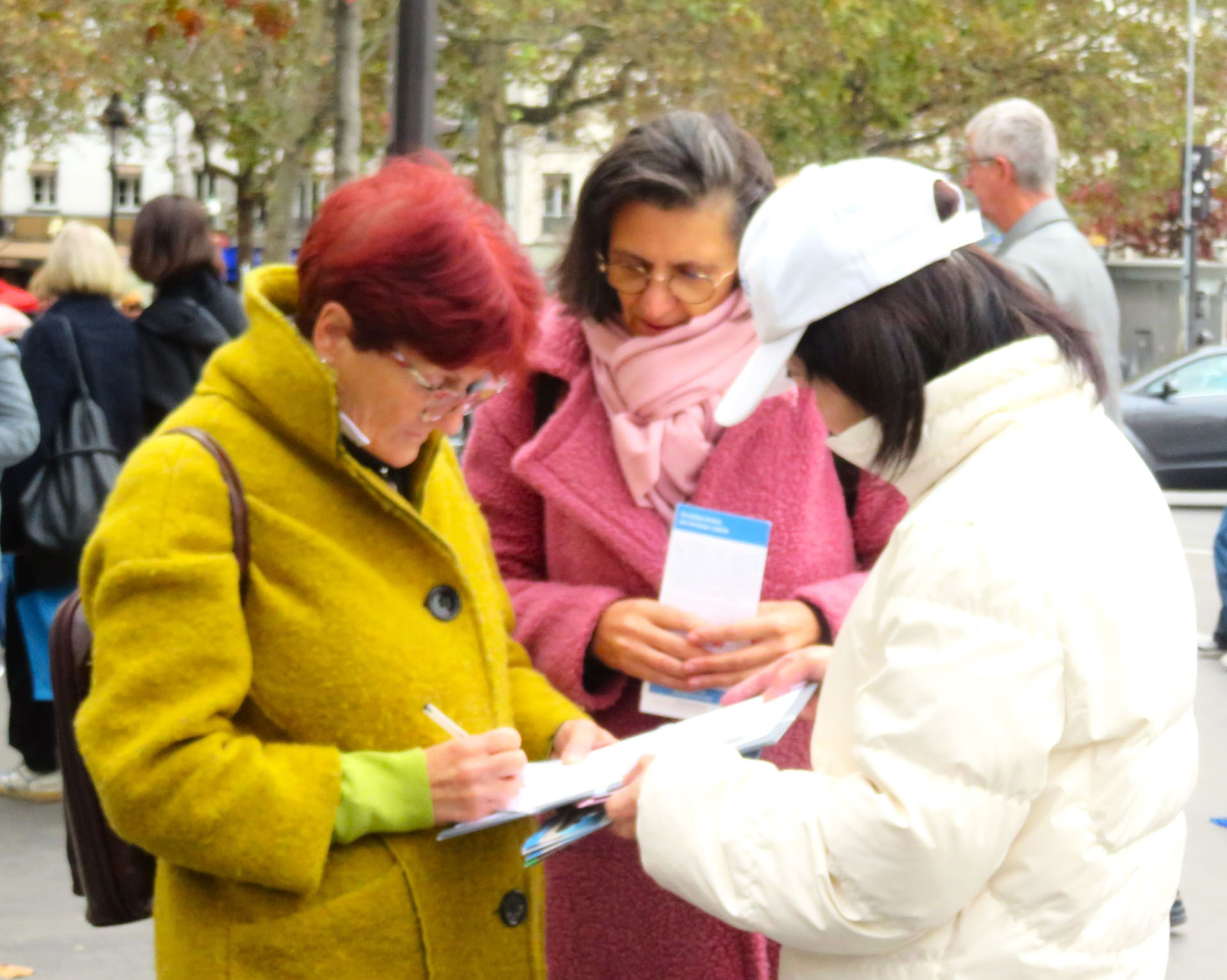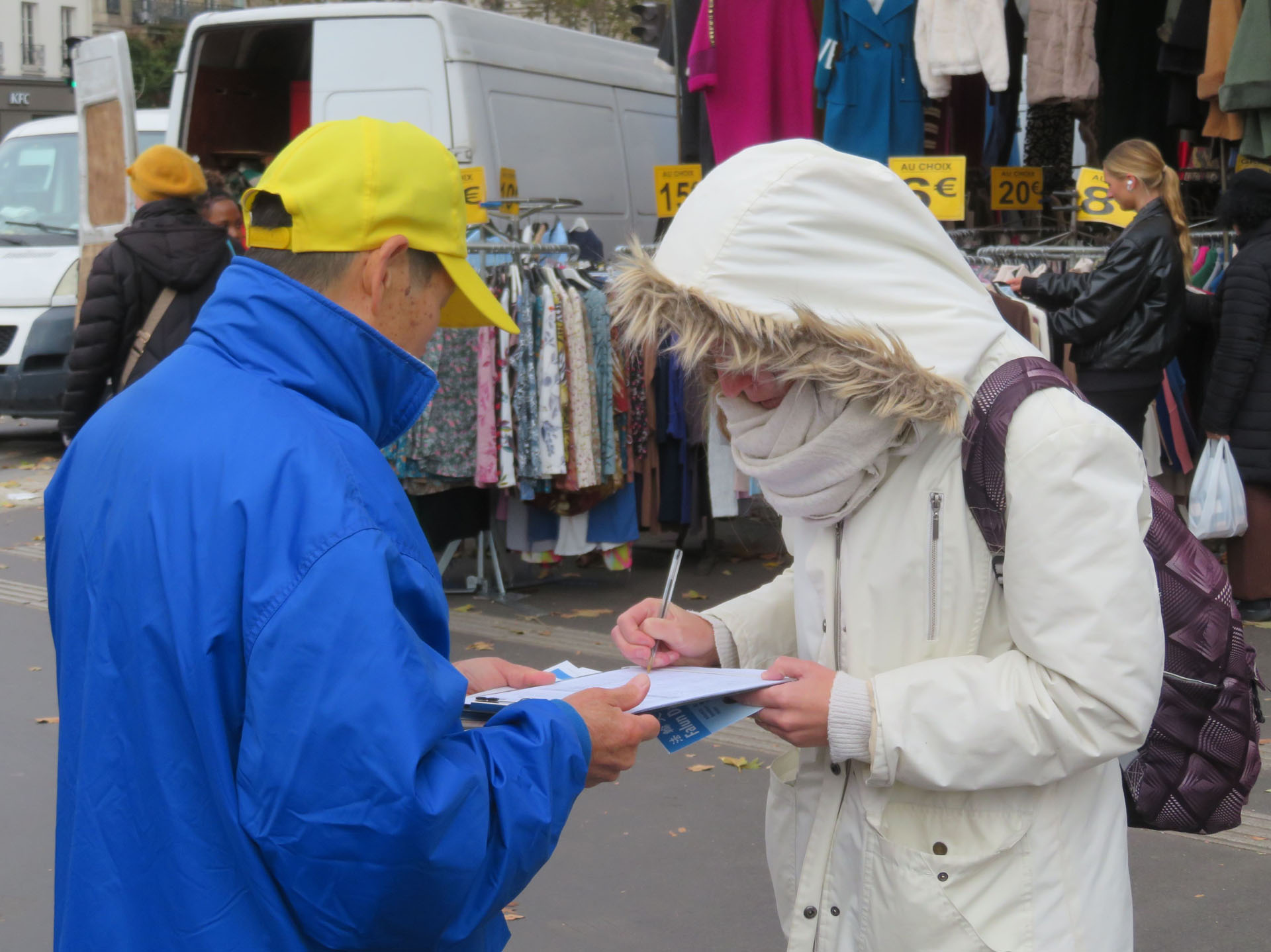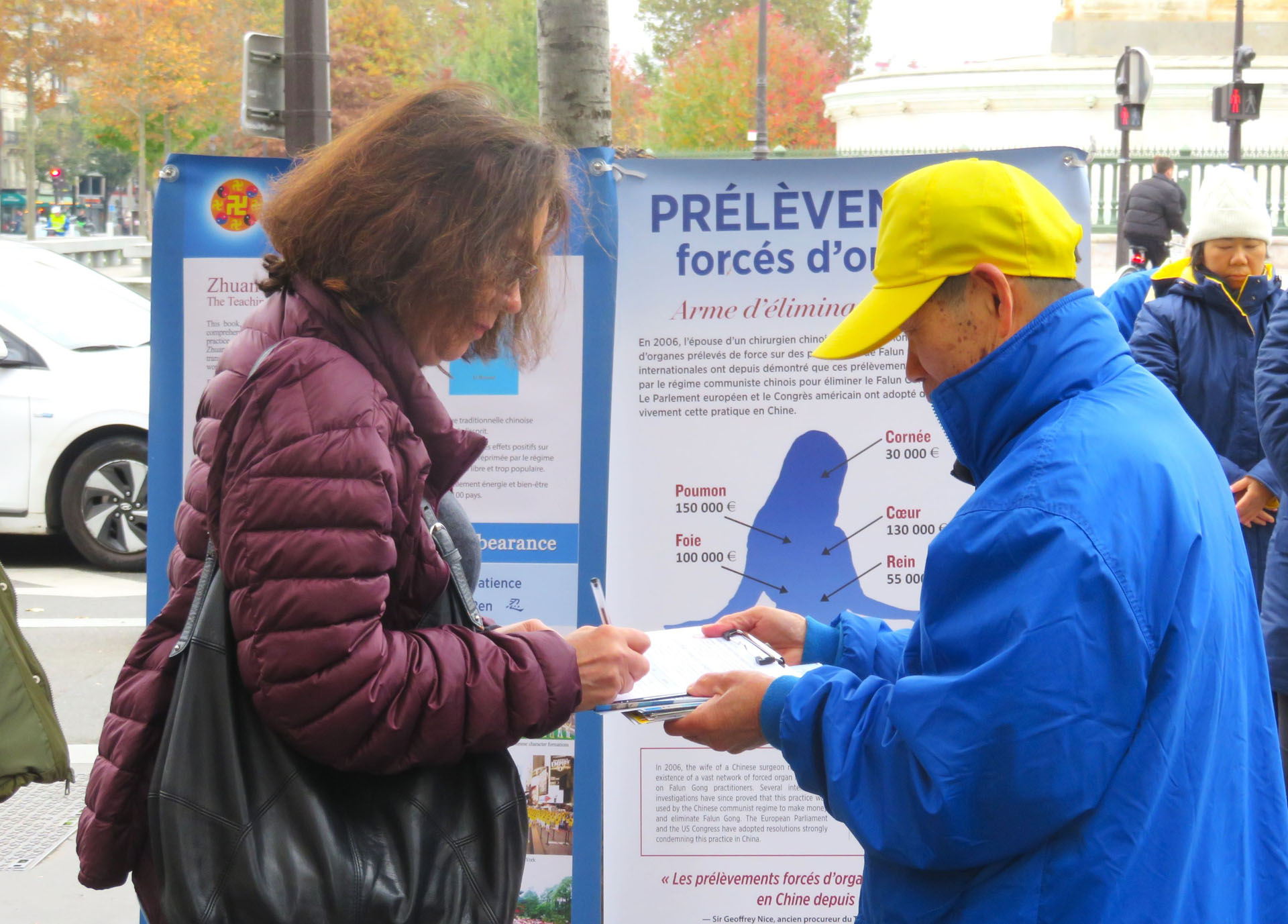前大学教授Cantal看到展板上有关活摘法轮功学员器官的信息后,直接在征签表上签名,她说:“我希望这能有所帮助,我们都知道中国(共)的政权非常可怕。”她希望早日停止迫害。