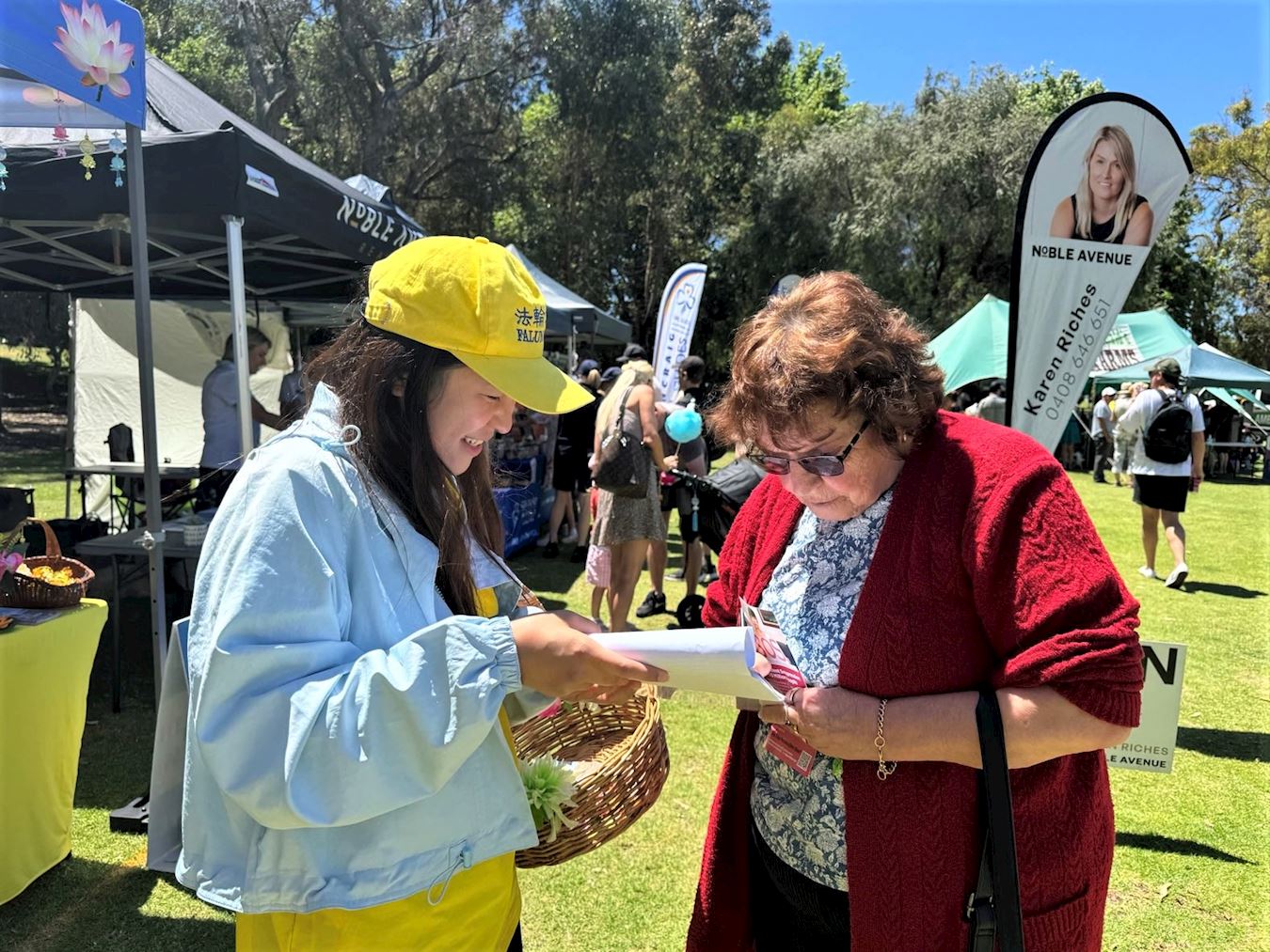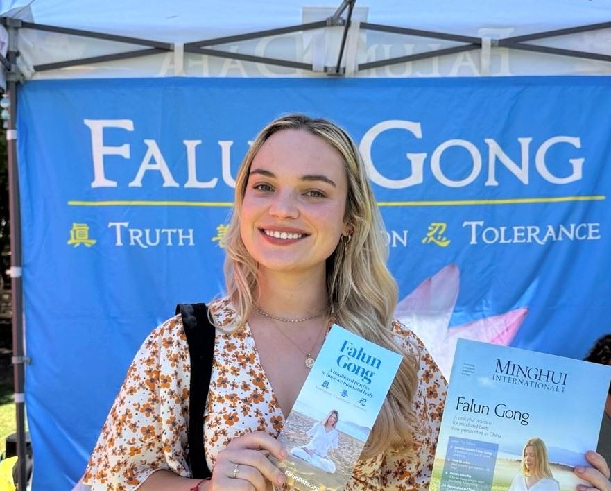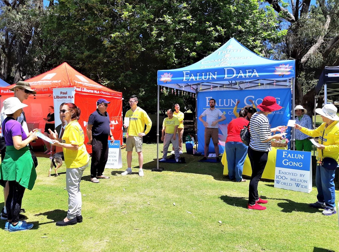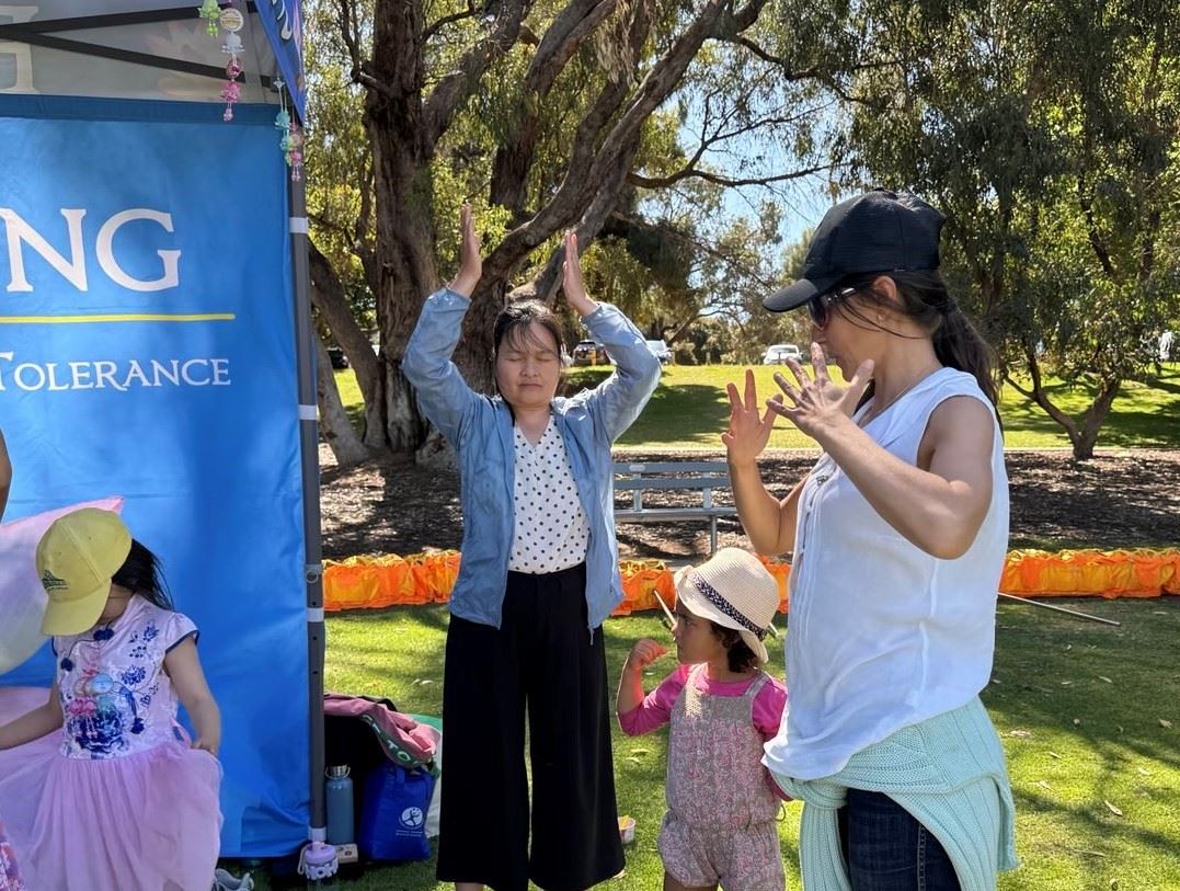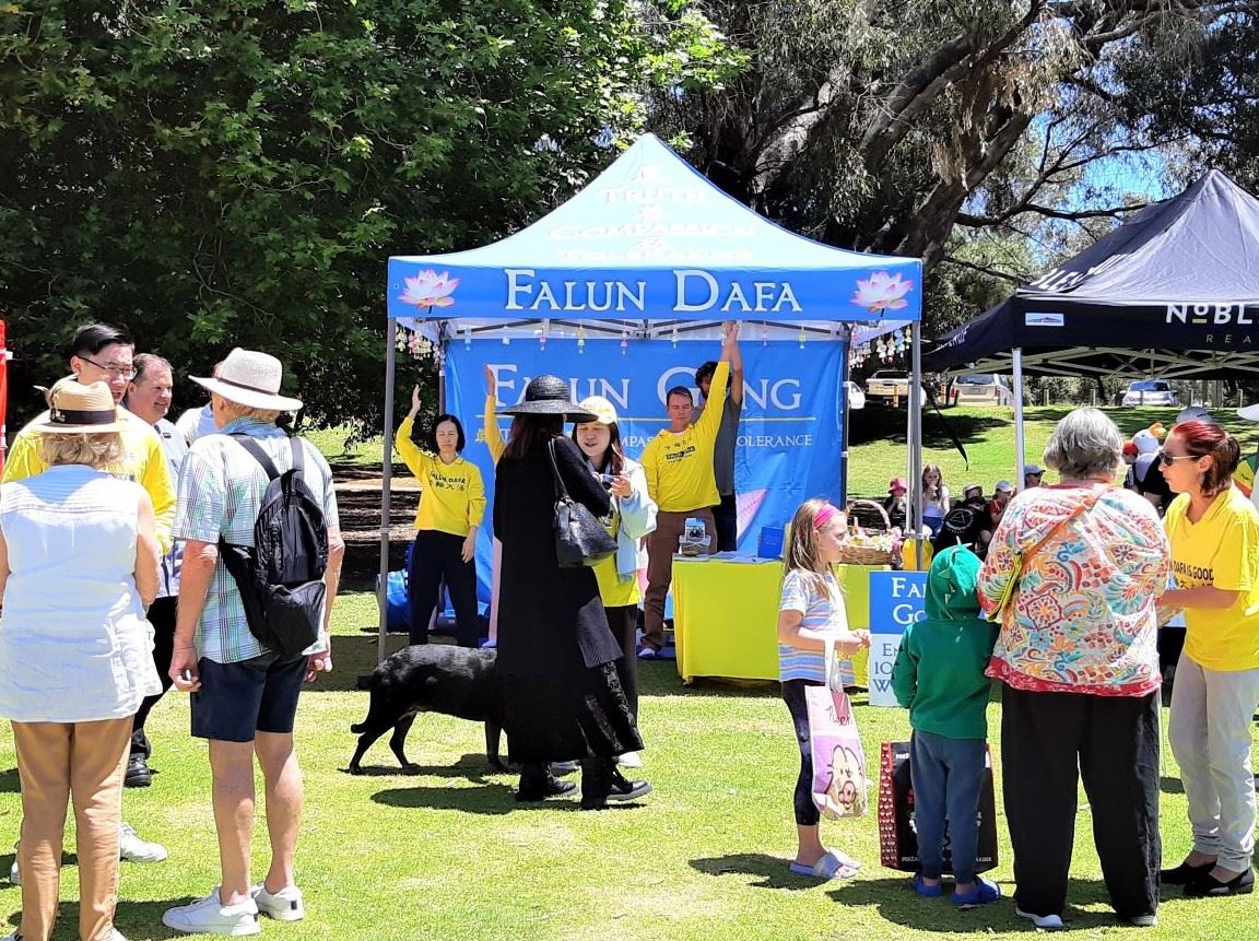 学员在展位上介绍法轮功并演示五套功法,传递真、善、忍的美好,讲述法轮功学员受中共迫害的真相。络绎不绝的游客被法轮大法展位吸引,人们接过真相资料,了解法轮功,并在制止中共迫害法轮功的征签簿上签名,支持法轮功学员和平反迫害。很多人对学炼功法感兴趣,询问当地炼功点。在大法展位附近有一个扶轮社展位,他们目睹来法轮大法展位参观的游客特别多,其中的一名扶轮社成员走过来对法轮功学员说:“你们做得很棒。”