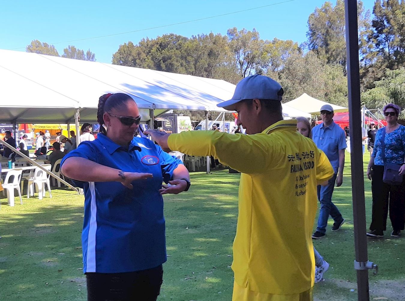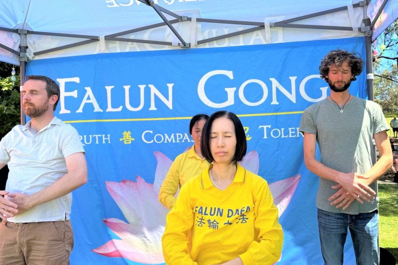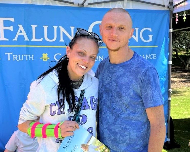戴夫·凯勒(Dave Kiellor )和坦妮卡·休伊特(Tennika Hewitt)被法轮功学员的功法演示所吸引。休伊特说:“看到他们打坐令人很感兴趣。这里的展位也很明亮。”凯勒说:“人们在这里静心打坐,还有法轮大法的价值观很吸引人。”