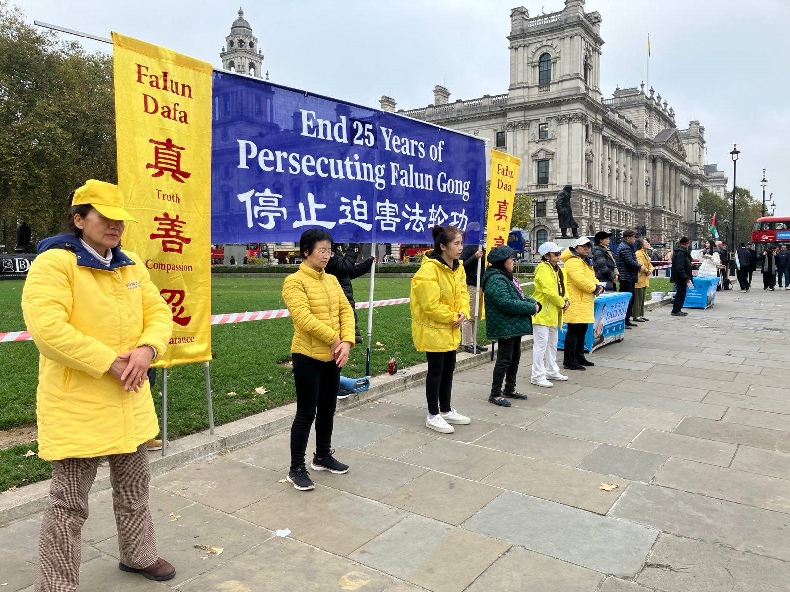 在议会大厦举办研讨会的当天,有部分法轮功学员在议会外广场洪法,讲真相。他们打出“停止迫害法轮功”,“真善忍”等横幅,向行人分发真相传单和征签,呼吁人们一起行动起来制止中共对法轮功的持续迫害。