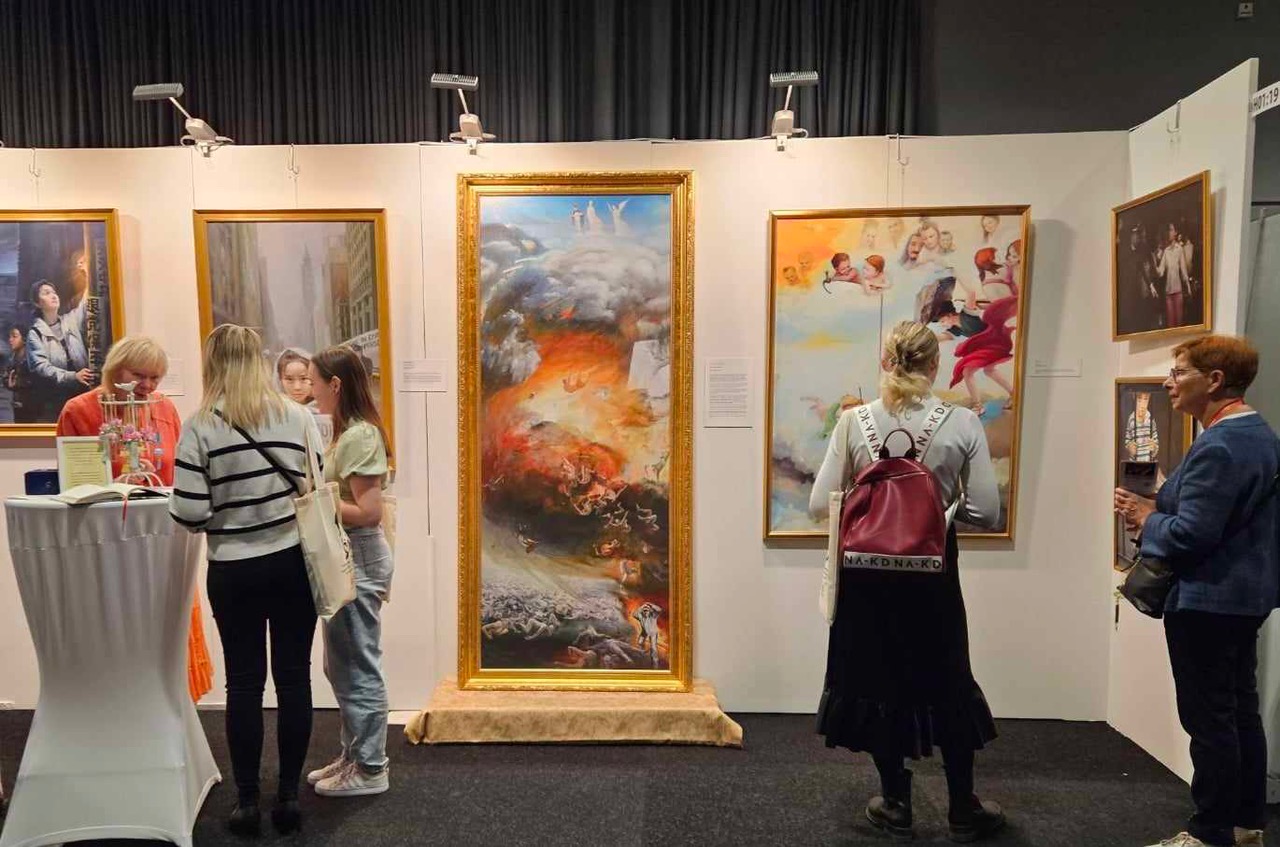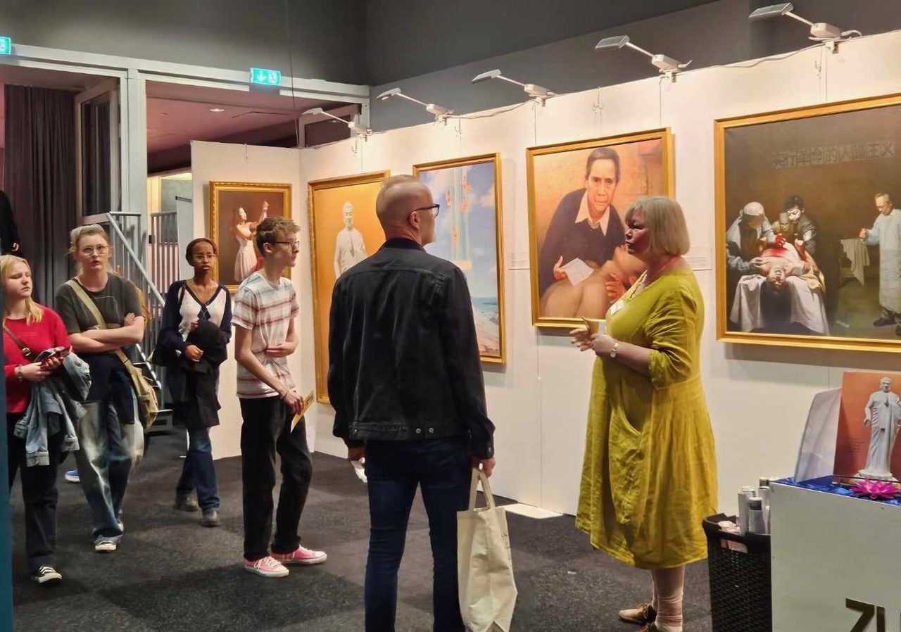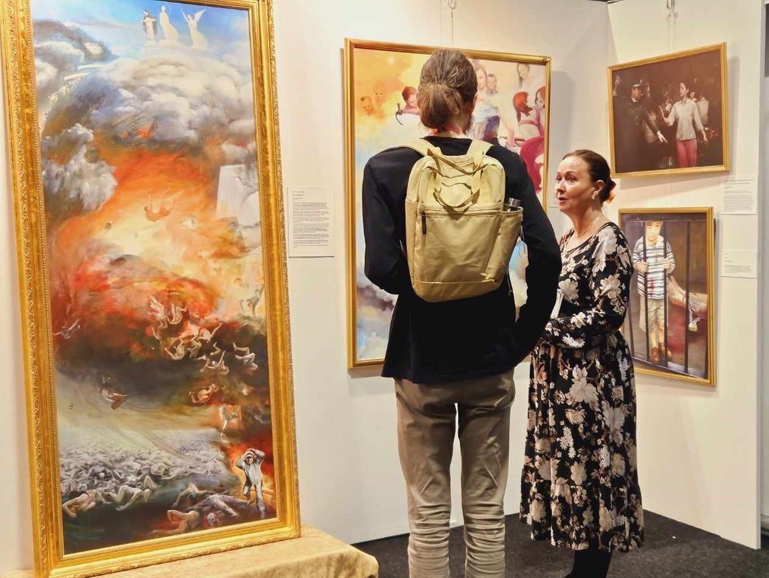 美展吸引了各个年龄段人士,几位高中生对画作中所传达的信息感到非常好奇,他们提出了很多问题,学员向他们介绍了法轮大法是什么,以及过去二十五年来法轮功在中国所遭受的残酷迫害。