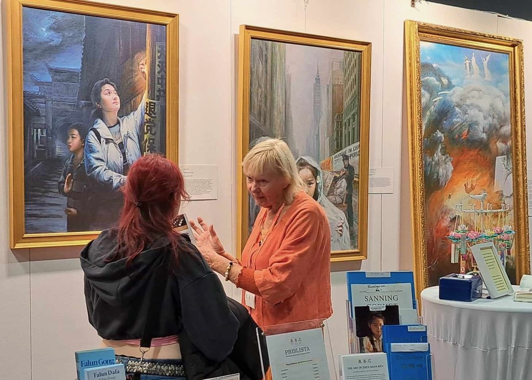一位女士被美展深深地感动,她认为这些艺术品以一种感人的方式与她对话。她很想了解什么是修炼,因此购买了《法轮功》和《转法轮》两本书,由于她所在的地方没有炼功点,学员告诉她可以参加网络免费教功班,她非常开心。