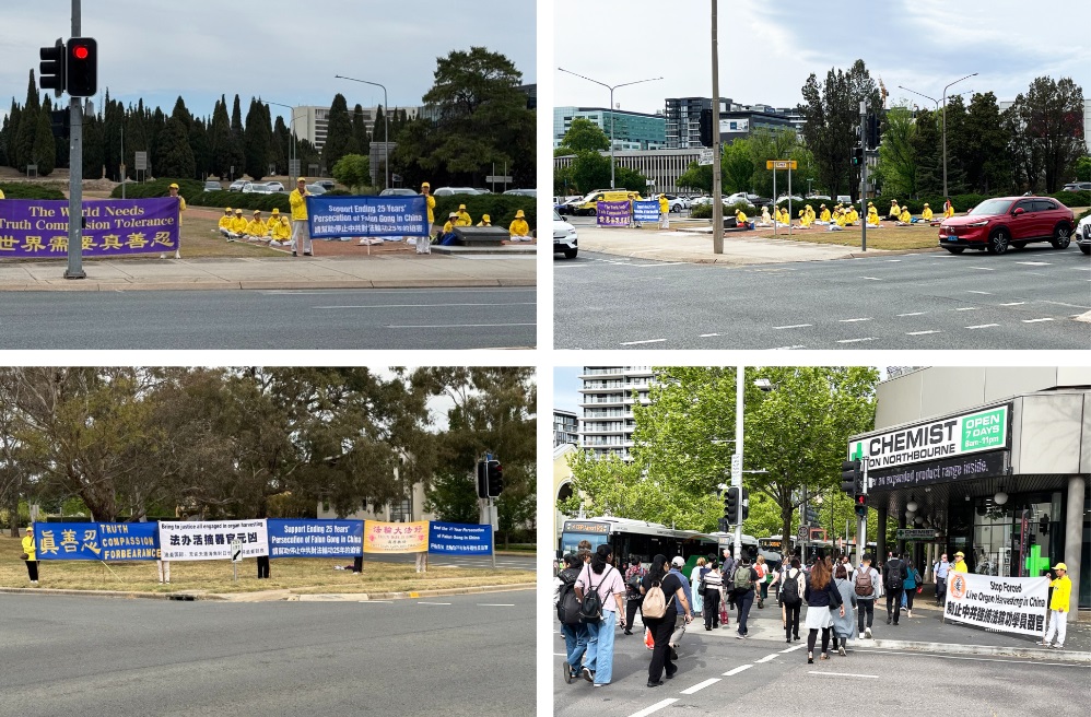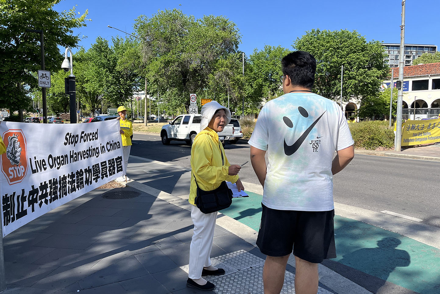 四天活动期间,法轮功学员们走访和征签的人士包括法律界、医学界、商业界和首都工业区的商家。在堪培拉市中心步行街,法轮功学员设置展位,传递法轮大法的美好以及中共迫害法轮功和活摘器官的真相,吸引来往的行人驻足了解,不少人接受了真相资料,并在征签表上签名。