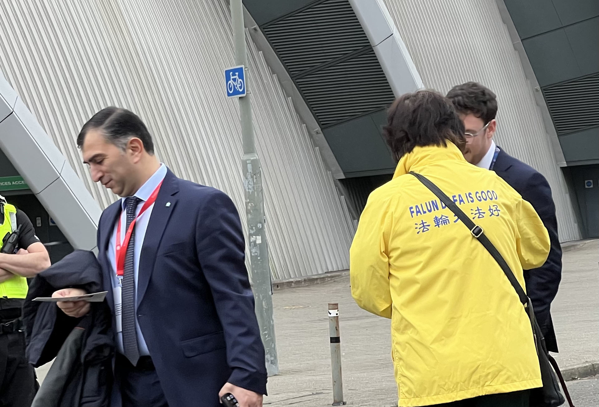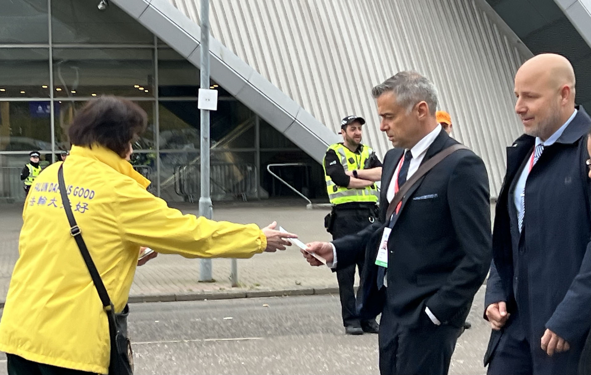 ![]() 图3~5:法轮功学员向出入主会场的人员发放真相资料 |