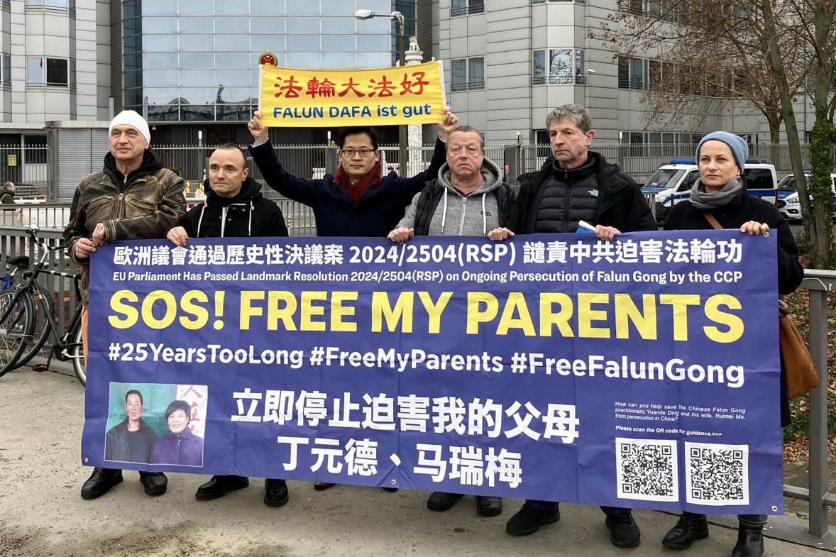 三十五年后,二零二四年国际人权日当天,他们再次聚首,一起来到中共驻德国大使馆前,分别手举横幅“法轮大法好”、“停止迫害法轮功”、“活摘法轮功学员器官天理不容”等,谴责中共对法轮功学员犯下的长达超过二十五年之久的反人类暴行。
