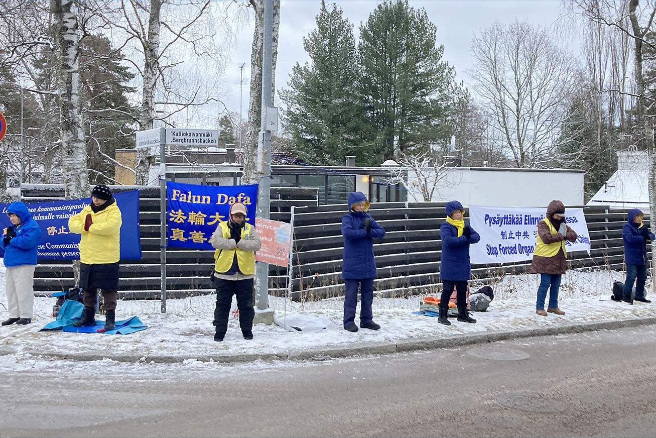 ![]() 图1:芬兰法轮功学员在赫尔辛基中共大使馆门前和平抗议。 |