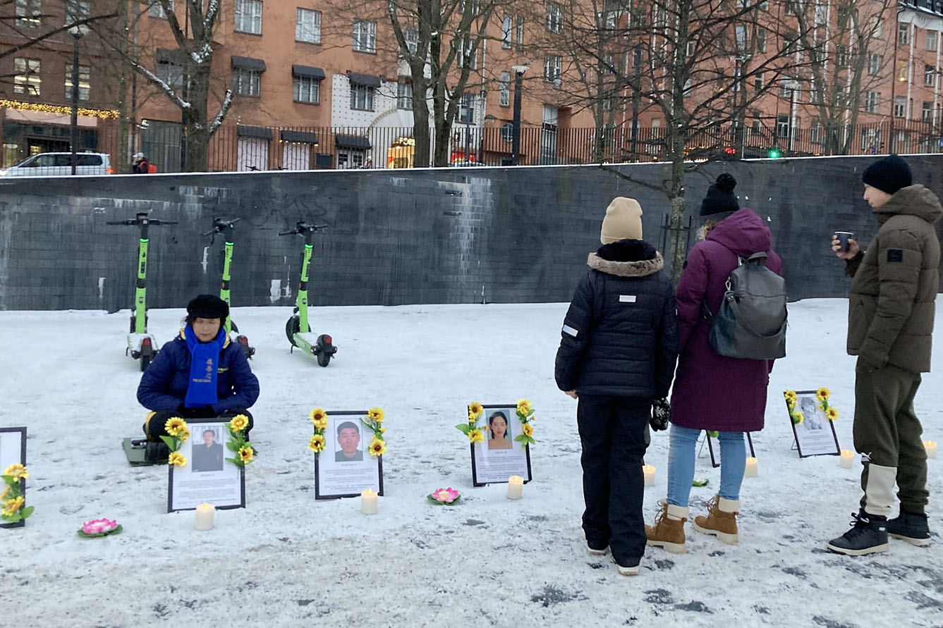 ![]() 图2~8:芬兰法轮功学员举行烛光悼念活动,明白真相的人们在学员的征签表上签名。 |
