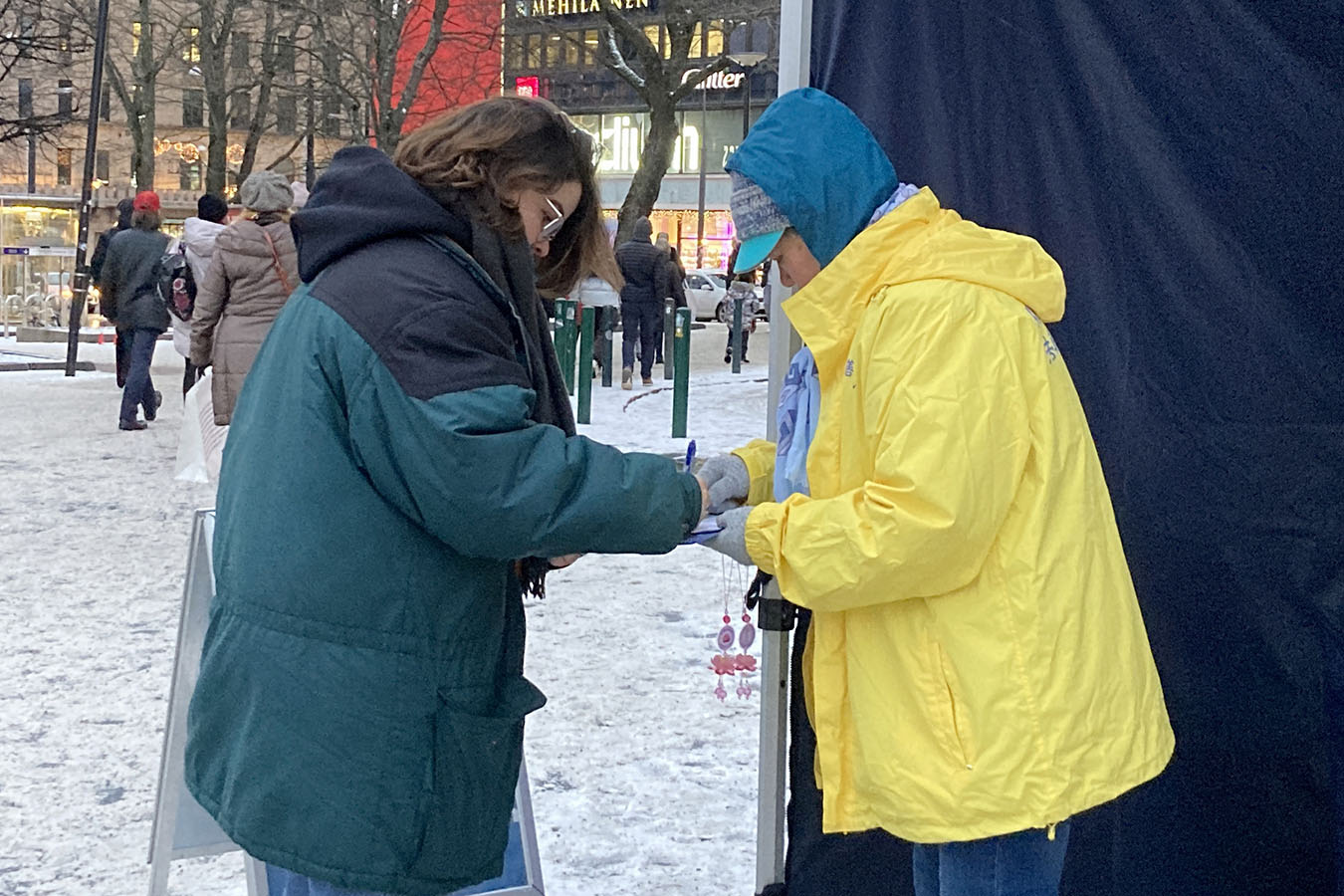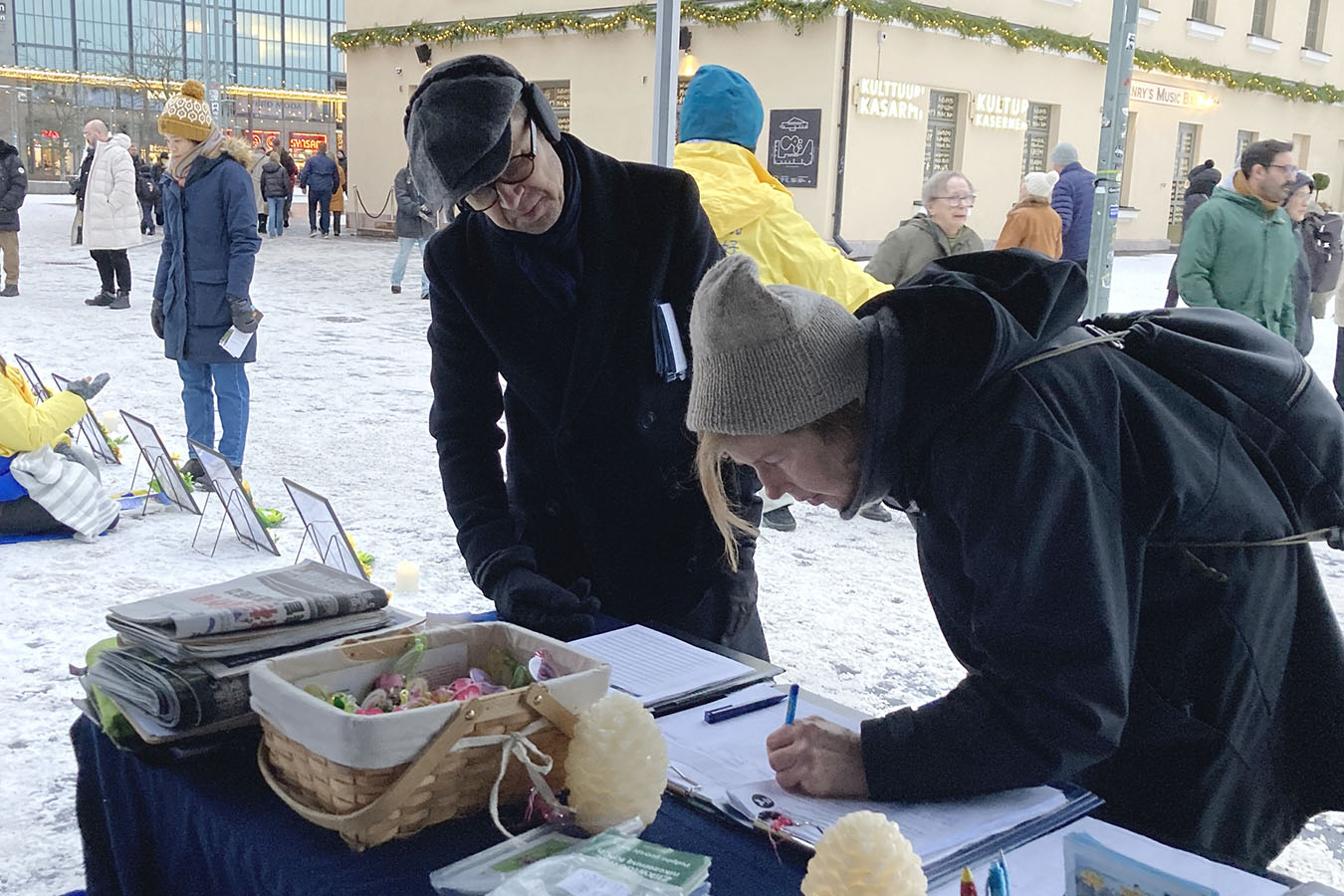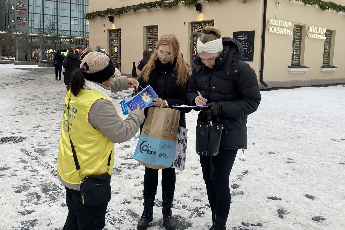 每年的十二月十日是国际人权日,也是《世界人权宣言》的周年纪念日。二零二四年国际人权日的主题是“我们的权利,我们的未来,就在当下”。在中国,法轮功受到中共惨无人道的迫害持续至今已经长达二十五年。芬兰法轮功学员在活动中要求中共停止迫害,立即释放正在被非法关押的法轮功学员,停止活体摘取法轮功学员器官的反人类罪行。