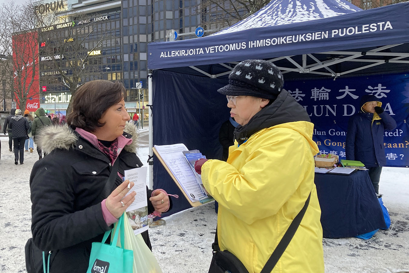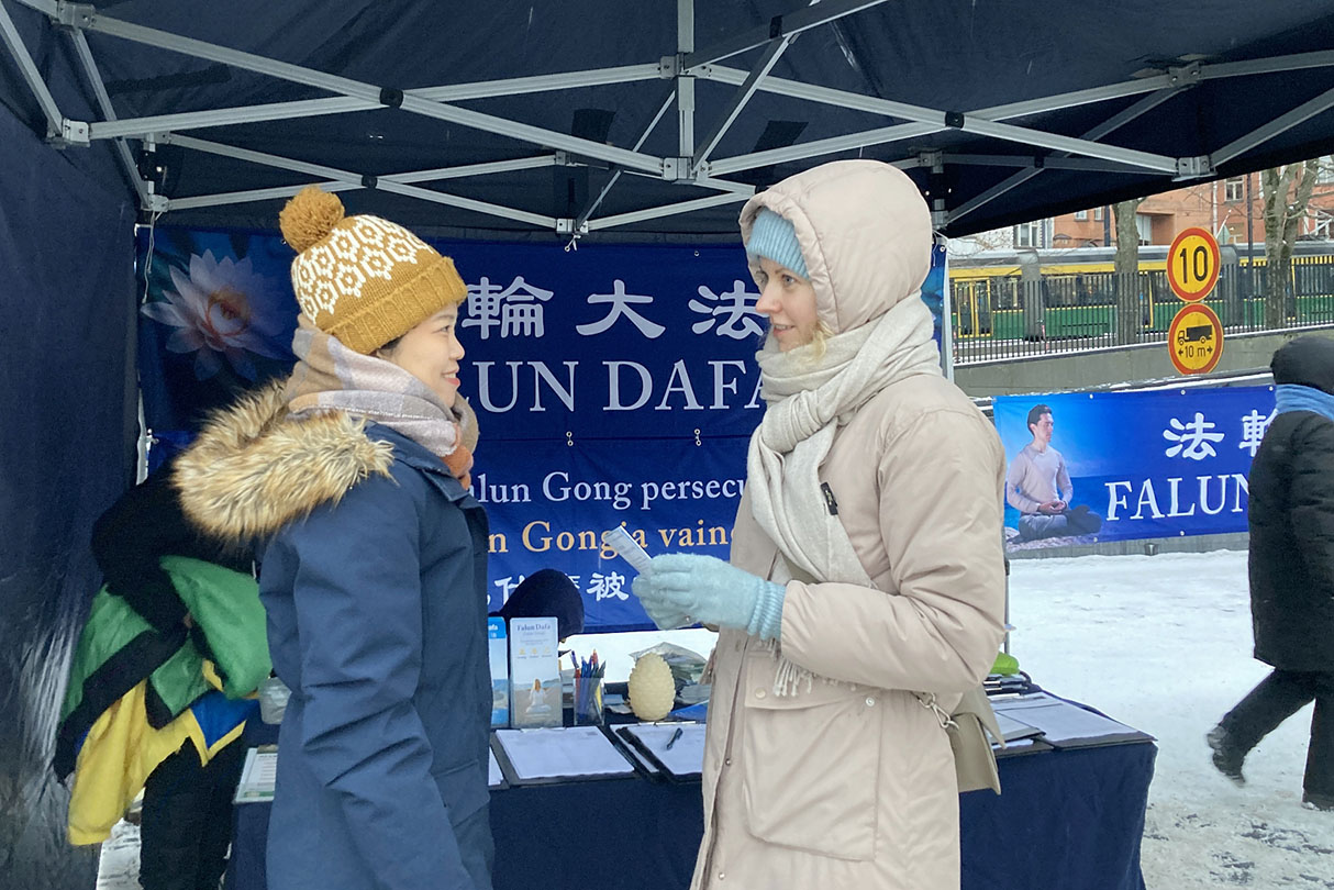 一位来自澳大利亚的女士,目前居住在芬兰。学员指着旁边正在发真相资料的一位法轮功学员说她的先生和母亲都因为修炼法轮功被中共迫害致死。女士被感动了,她含泪走到学员身边,并展开双臂拥抱了一下这位学员。她表示很难过,并认为中共发动这场迫害是不可理喻的。