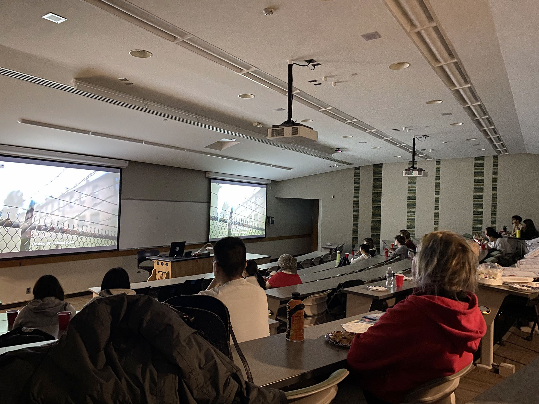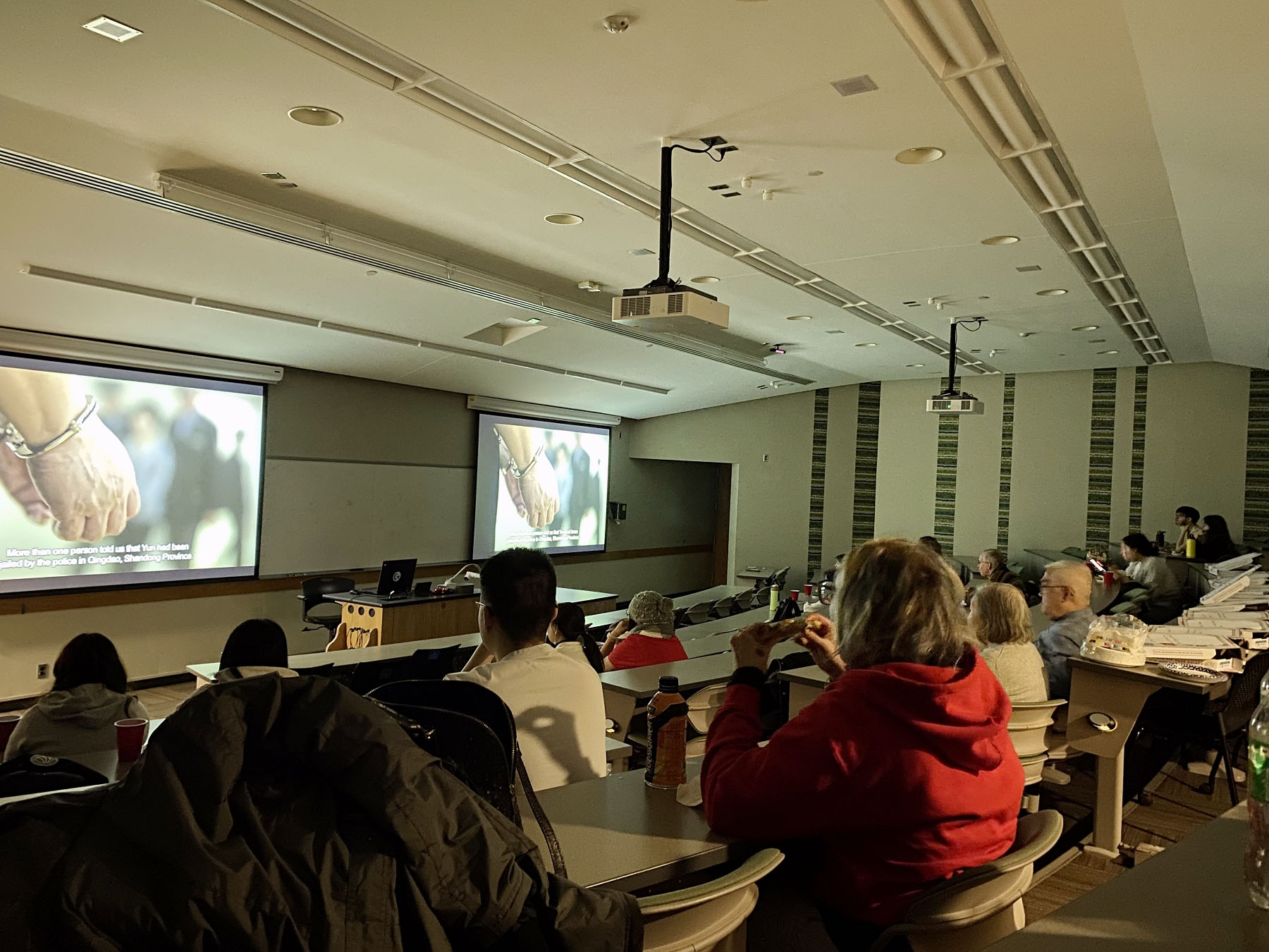 ![]() 图1~2:美国明尼苏达大学双城分校的法轮功学生俱乐部(Falun Gong Twin Cities Club)放映纪录片《国有器官》,揭露中共活摘法轮功学员器官的滔天罪行,观众专注观看影片。 |