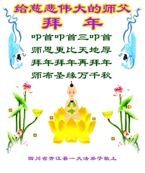 慈悲伟大的师尊新年好!师尊辛苦了!一晃一年又将过去,感恩师尊在这一年对弟子的加持与保护。修炼这么多年,弟子似乎才开始修忍了,才真正明白弟子的每一步都倾注了师尊的无限给予,为了弟子的提高,师尊为我承受无限。弟子感恩师尊!弟子跪拜师尊!