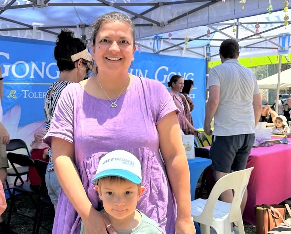 克林特·亚瑟(Clint Arthur)表示,当看到法轮功学员演示功法时,他感受到了能量。他的儿子在法轮功展位旁的“托马斯小火车”上兜风玩耍,亚瑟在旁边陪伴。亚瑟说:“我正在看儿子坐在小火车上跑第二圈,然后意识到我需要回到我感受到能量的地方,模仿做我能看到的这个姿势,我就回到了这里(法轮功展位)。”
