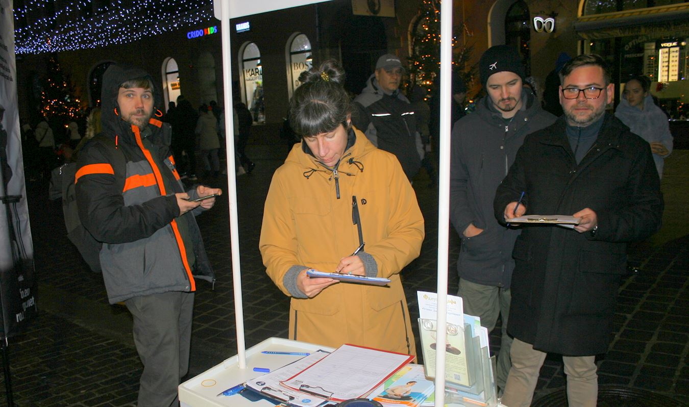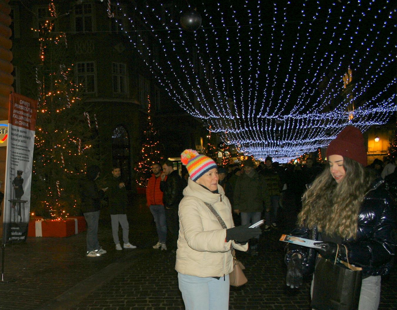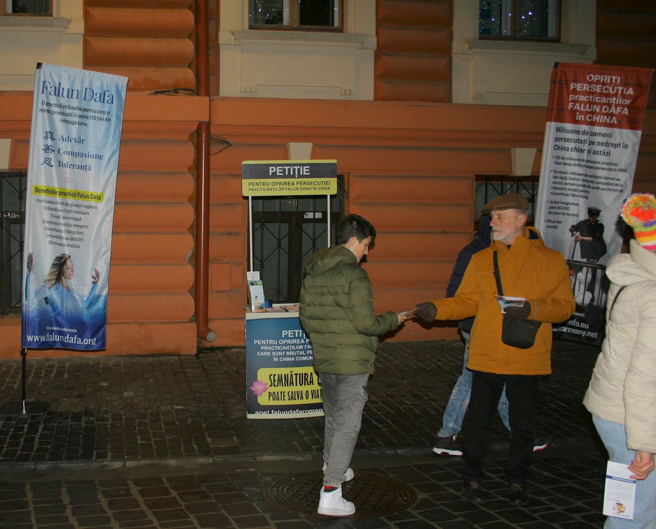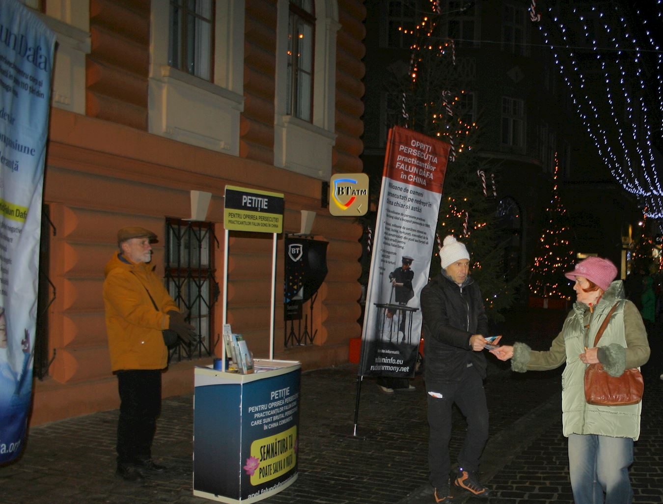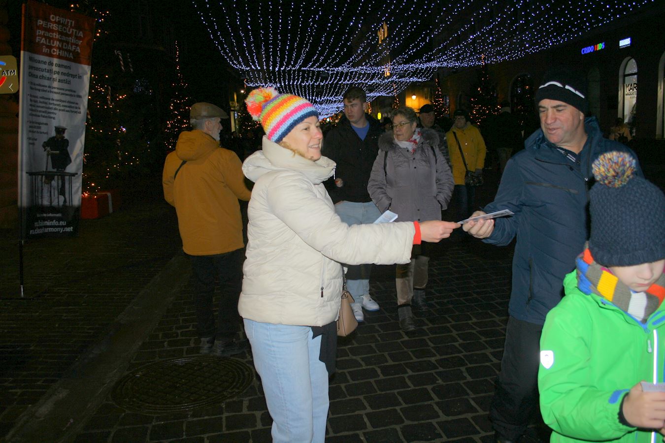 来自布拉索夫的经济学家比安卡·波帕(Bianca Popa)多年来一直支持法轮大法,每年都会在请愿书上签名。十一月二十三日,她来到法轮大法展位前,鼓励学员道:“我第一次听说法轮大法是在很多年以前,也许是十多年前,那次让我突然意识到我们所生活的世界是如此残酷。(中共)针对和平的修炼者所实施的虐待、骚扰、仇恨政治,甚至杀戮,让我深感愤怒,于是我开始寻找更多的信息。”