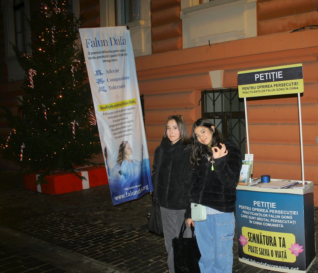 十一月二十三日,来自台湾的年轻华人女士金·阿提亚斯(Kim Atias)和朋友、来自布拉索夫的学生朱莉娅·米亚(Giulia Miia )在法轮大法展位前签名,谴责中共所犯下的反人类罪行。