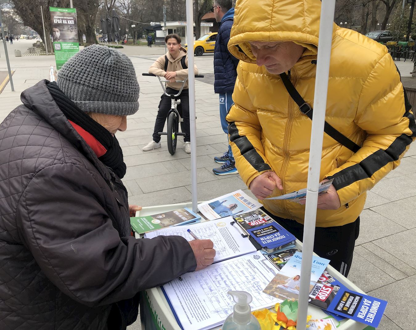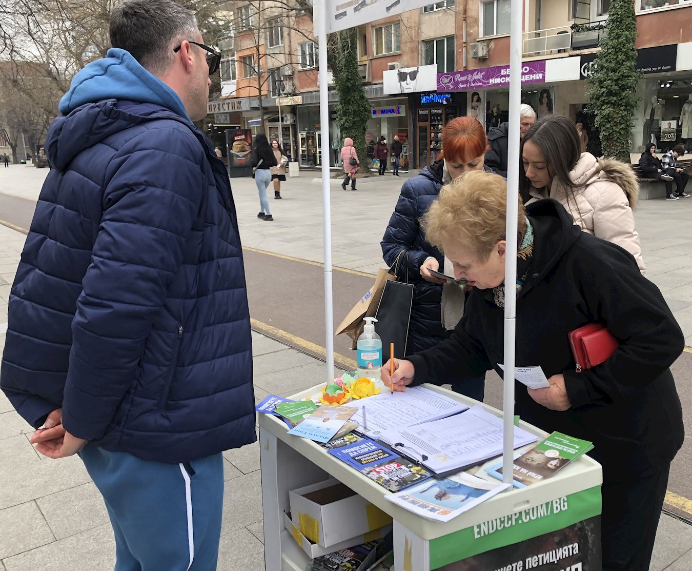 一位骑自行车的男士希望了解更多情况,学员向他解释说,一份请愿书是呼吁解体中共,并立即停止侵犯人权的罪行;另一份请愿书敦促保加利亚机构和公民不要成为(中共)器官非法交易的帮凶,这些被活摘的人体器官大部份来自中国法轮功学员。