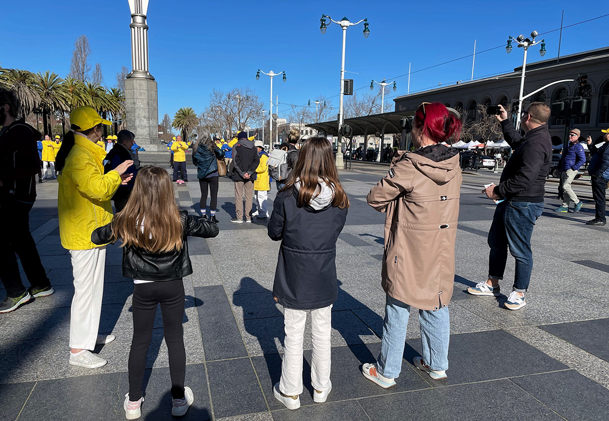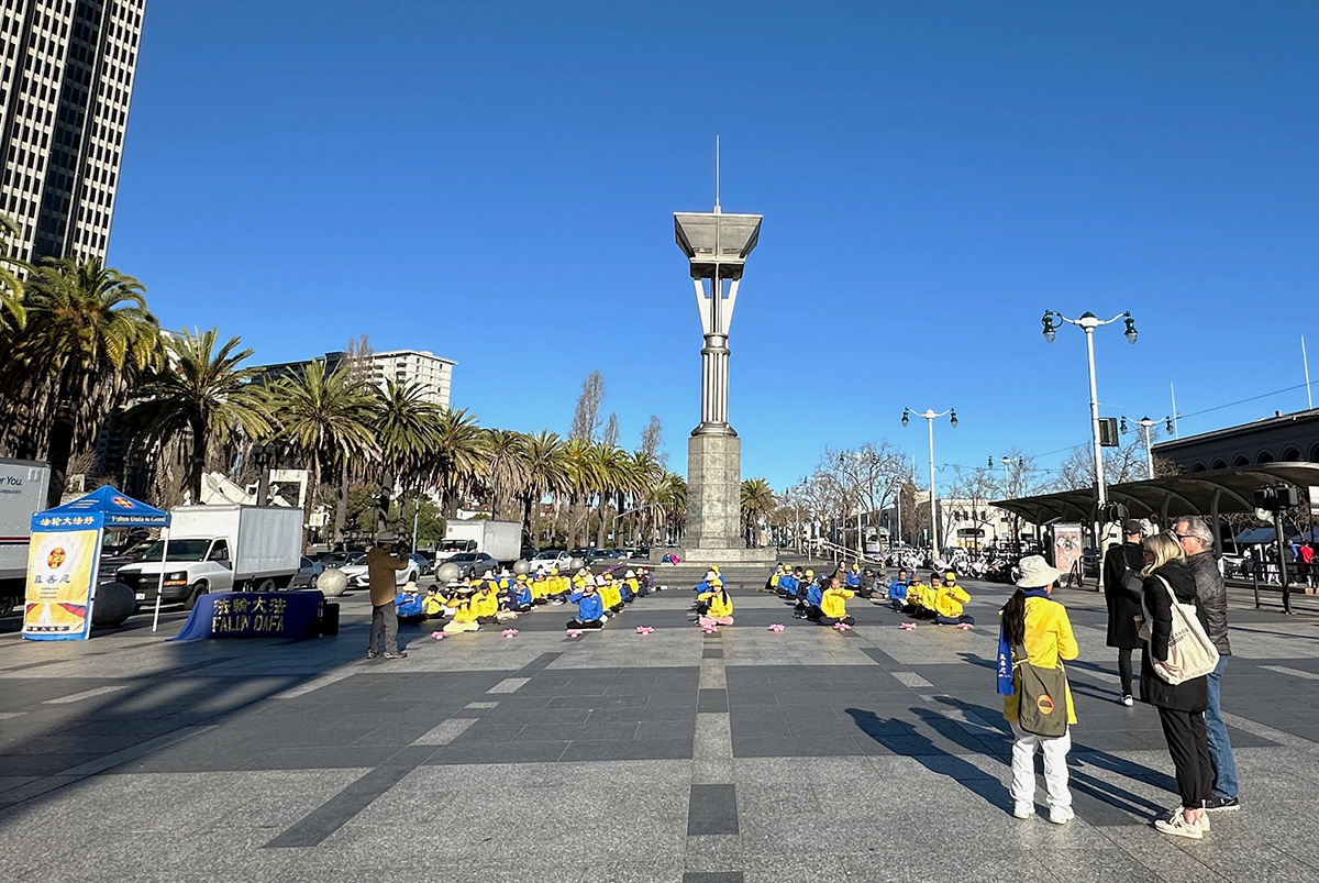 当天是周六,渡轮大厦边的农民市场每逢周六开放,还有工艺品的摆摊,所以这天会有很多游人来到广场。刚经历了一周的暴风雨,旧金山的道路被冲洗地非常干净,而且当天阳光明媚,在蓝天下,学员们展示了法轮功优美的五套功法,伴着祥和的炼功音乐,吸引了众多行人驻足观看,了解法轮功,他们离开时不仅跟学员道谢,并说:“新年快乐!”