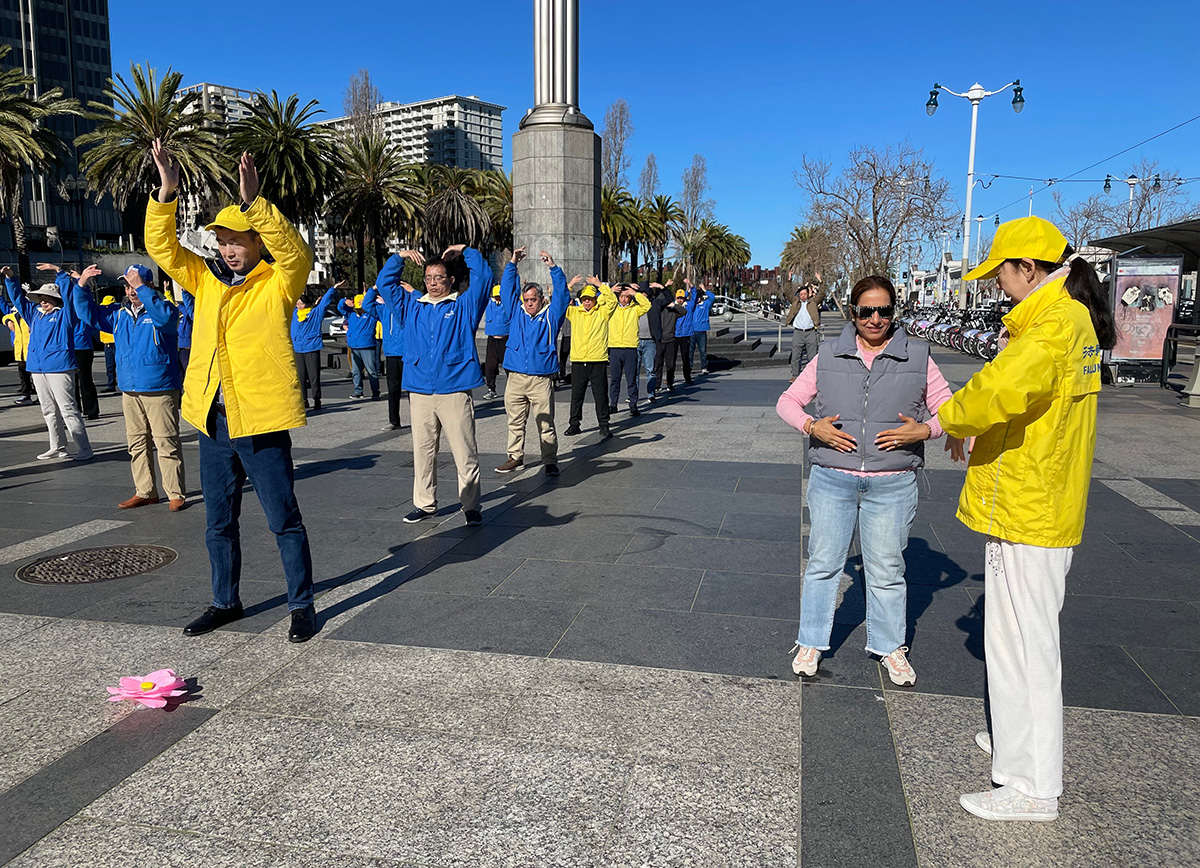 从英国来旧金山旅游的索尼娅(Sonia)女士被祥和的炼功场面吸引,驻足了解。她告诉学员,她很喜欢中国文化,曾经去过中国,当她听到这么好的功法却不能在中国炼很是不解,了解到真相后,她谴责中共迫害法轮功,并说等她回到英国也要炼法轮功。