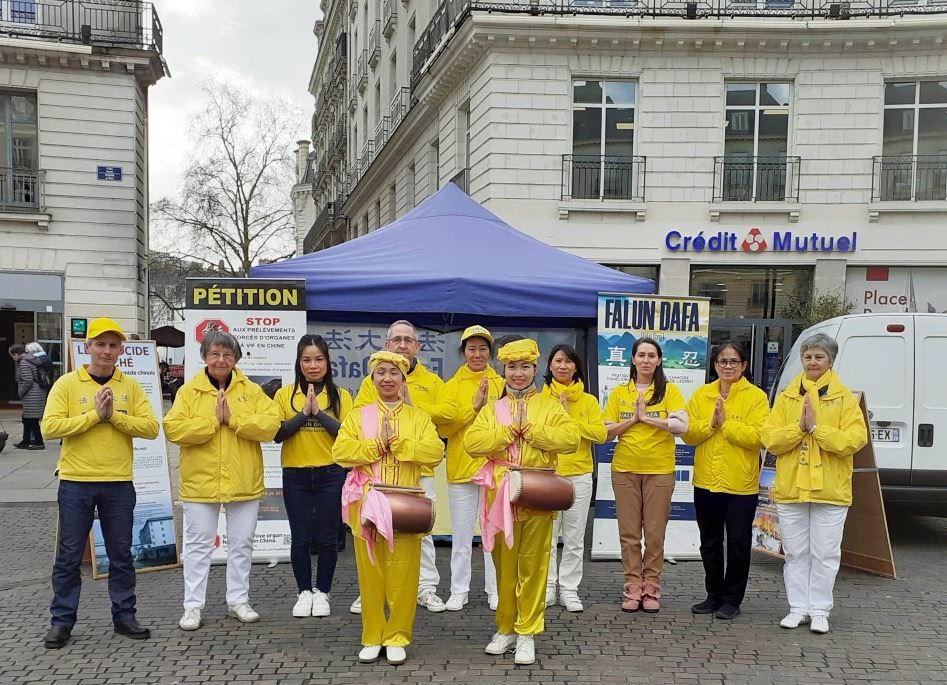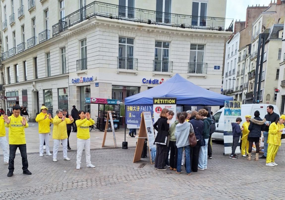 皇家广场是南特市举办艺术展览、节日活动或政治集会的场所。当天时雨时晴,人们被法轮功学员的腰鼓表演所吸引前来询问。当人们得知,中国的法轮功修炼者因信仰真、善、忍而遭到监禁,很多人深受触动,立刻在反迫害请愿书上签字。他们还希望深入了解法轮功及其带来的好处,有人表示,中共对法轮功学员的残暴行径应当立刻停止。