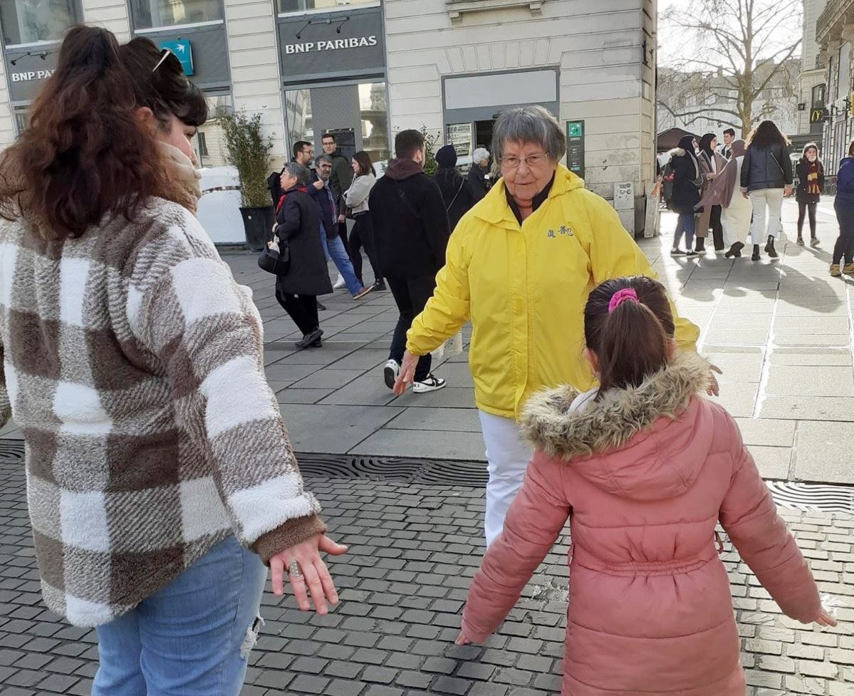 ![]() 图2:法轮功学员在南特市皇家广场(Place Royale)进行法轮功功法演示。 |