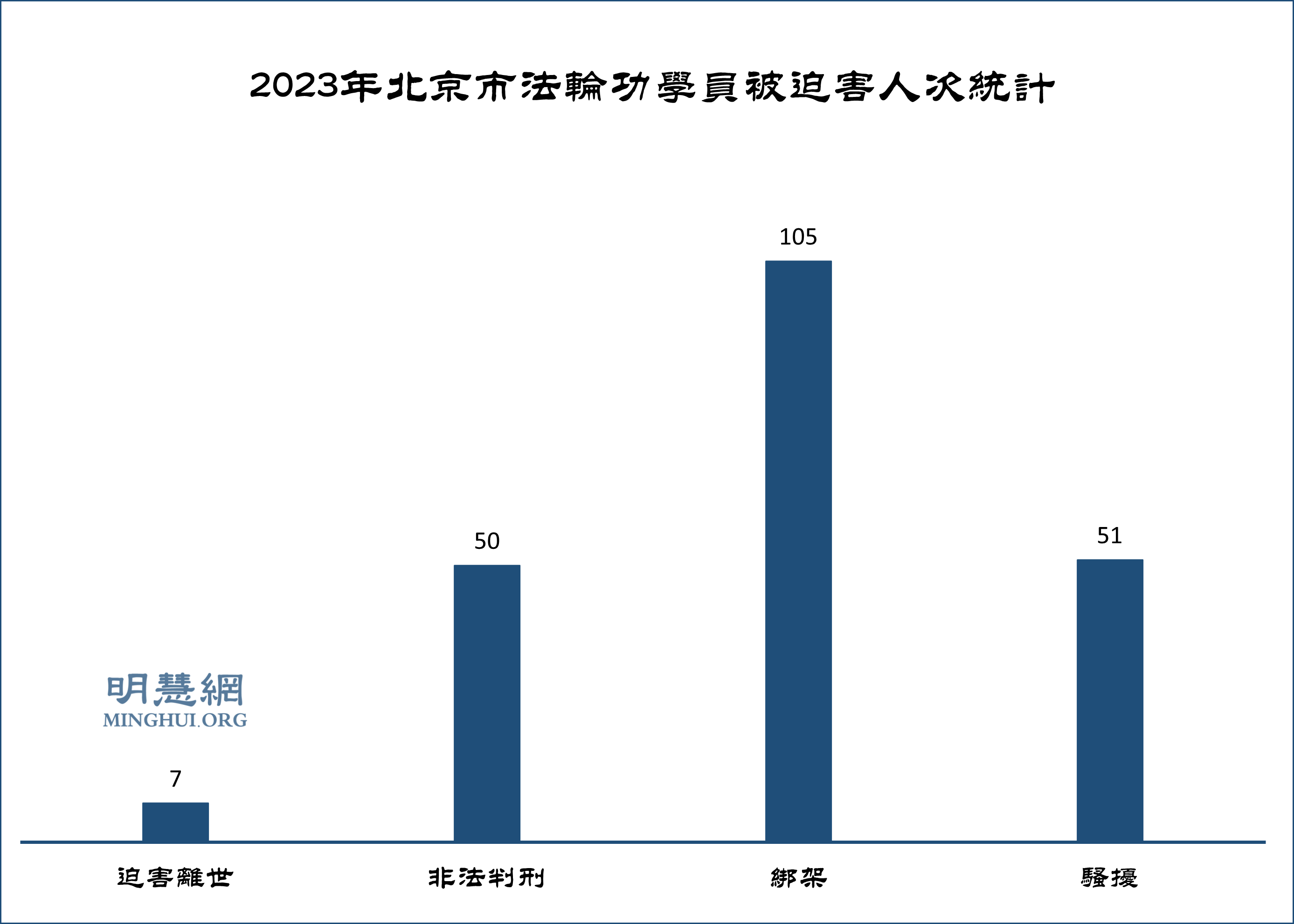 【明慧网二零二四年二月十五日】(明慧网通讯员北京报道)根据明慧网报道统计,二零二三年北京地区七名法轮功学员在迫害中离世,五十名法轮功学员被非法判刑,被勒索罚款累计十二万二千元,至少一百零五人次法轮功学员绑架、非法关押,众多法轮功学员被持续骚扰、监控等。