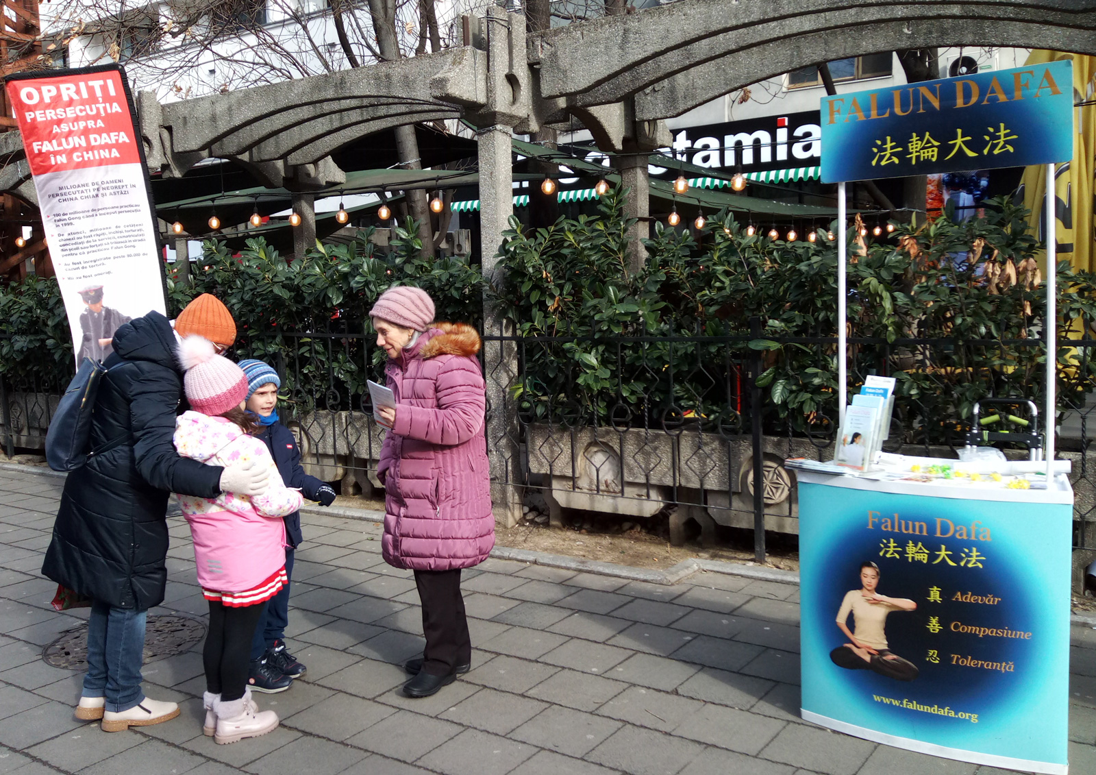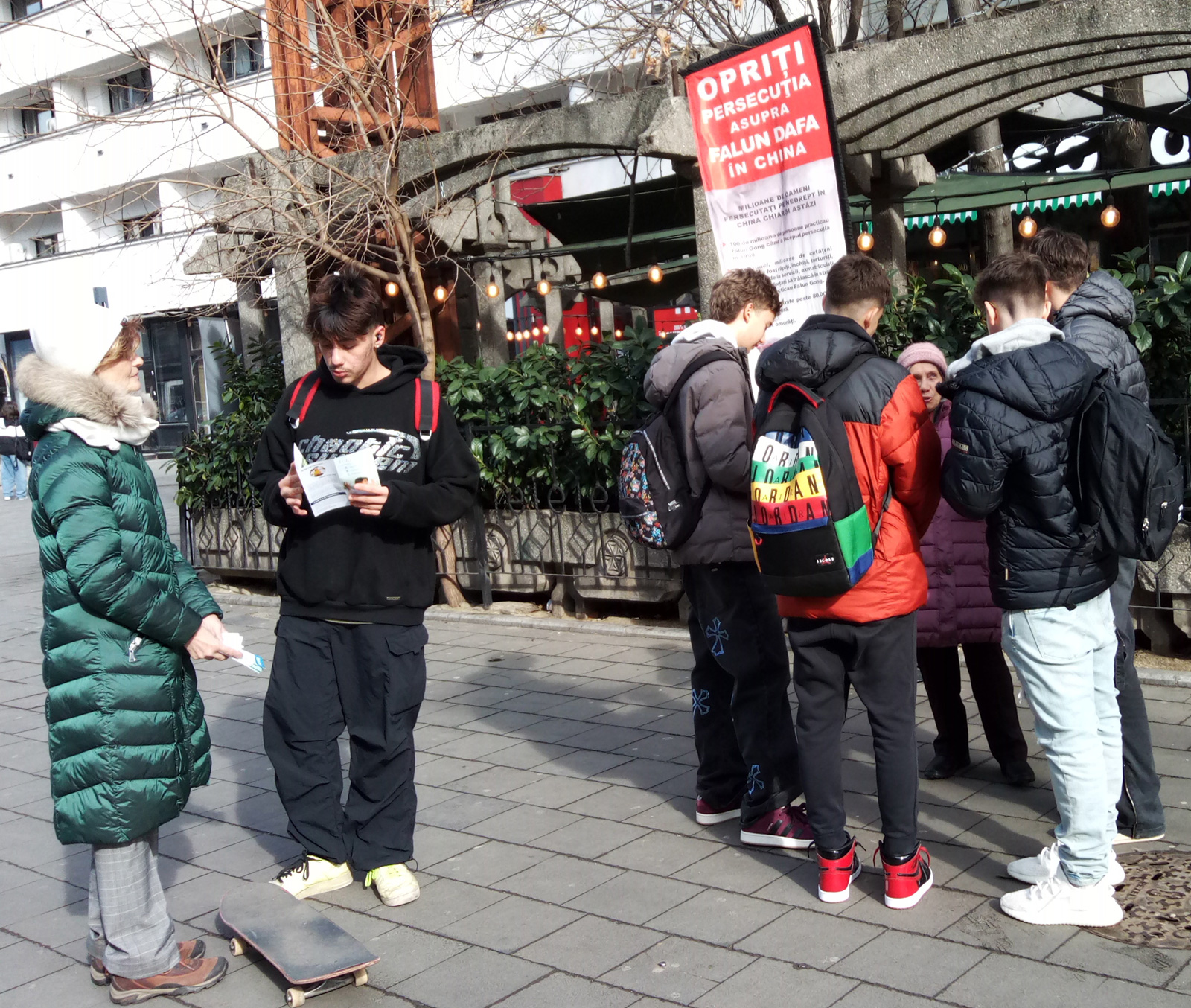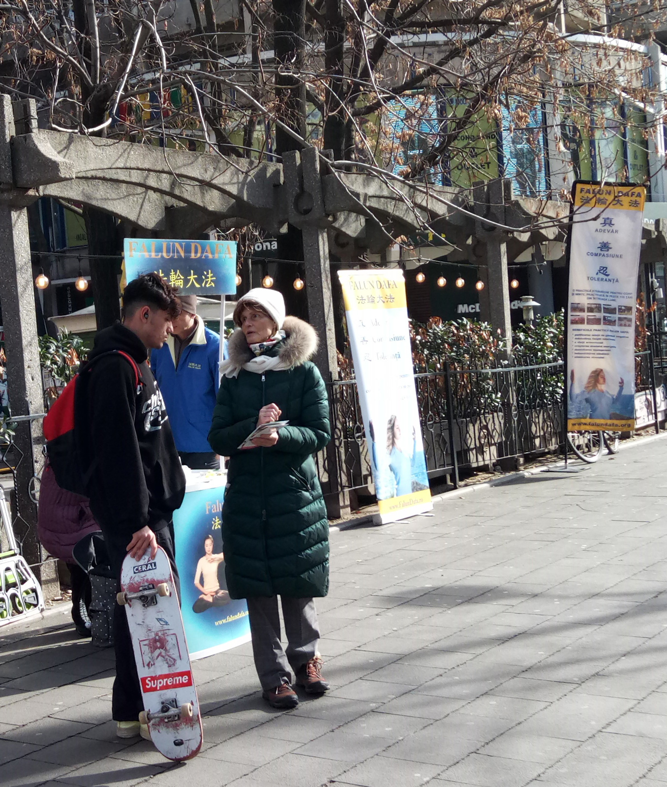 布加勒斯特大学文学院的四名学生来到法轮大法展位前,学员送给他们真相日历和传单。当详细了解了真、善、忍的原则后,他们赞赏学员们对美好价值观的坚持。