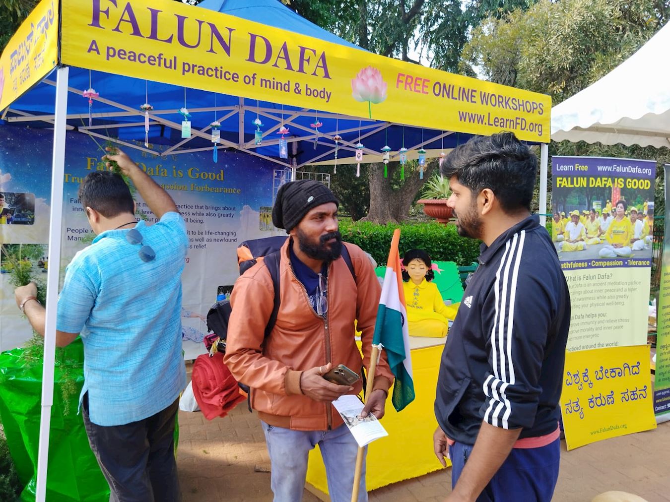花展第一天,马拉雅拉姆语电影导演文马尼·乌尼克里什南 (Venmani Unnikrishnan)来到法轮功的展位前,他表示,自己被法轮功所吸引,因为他“正在寻找一种能使他平静的功法”。法轮功真、善、忍的原则引起了他的共鸣,他想更多地探索法轮功如何帮助人们找到平衡。
