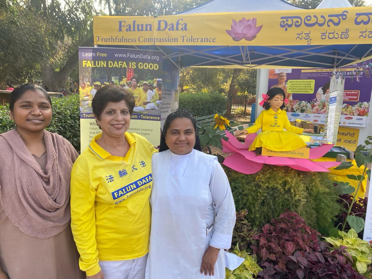 萨吉塔(Sr. Sajitha)女士在卡梅尔山学院(Mount Carmel College)任教,法轮功学员曾多次前往该校,教师生们学炼法轮功。萨吉塔在花卉展上表示,她敬佩法轮功学员为反迫害所付出的辛劳,并邀请学员下个月在该校展示这尊女子打坐像。