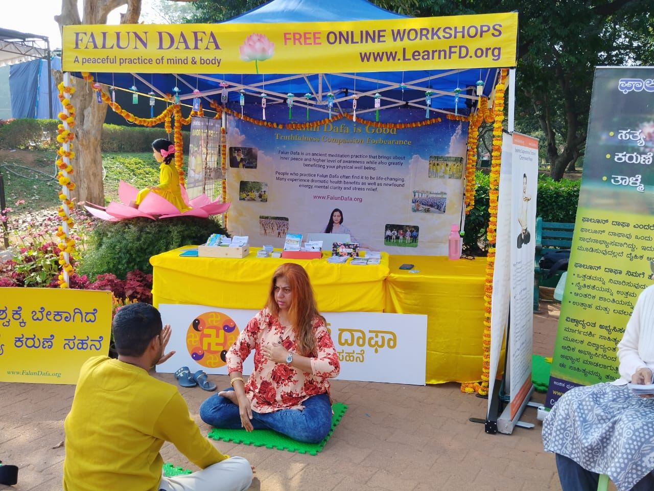 来自巴布萨帕拉亚(Babusa Palaya)的苏拉朱(Suraju)一直在探索打坐的深层内涵。在花展上,学员教她学炼了五套功法,她购买了《法轮功》和《转法轮》两本著作,以便继续修炼,她还告诉学员,以后她也要去炼功点与大家一起炼功。