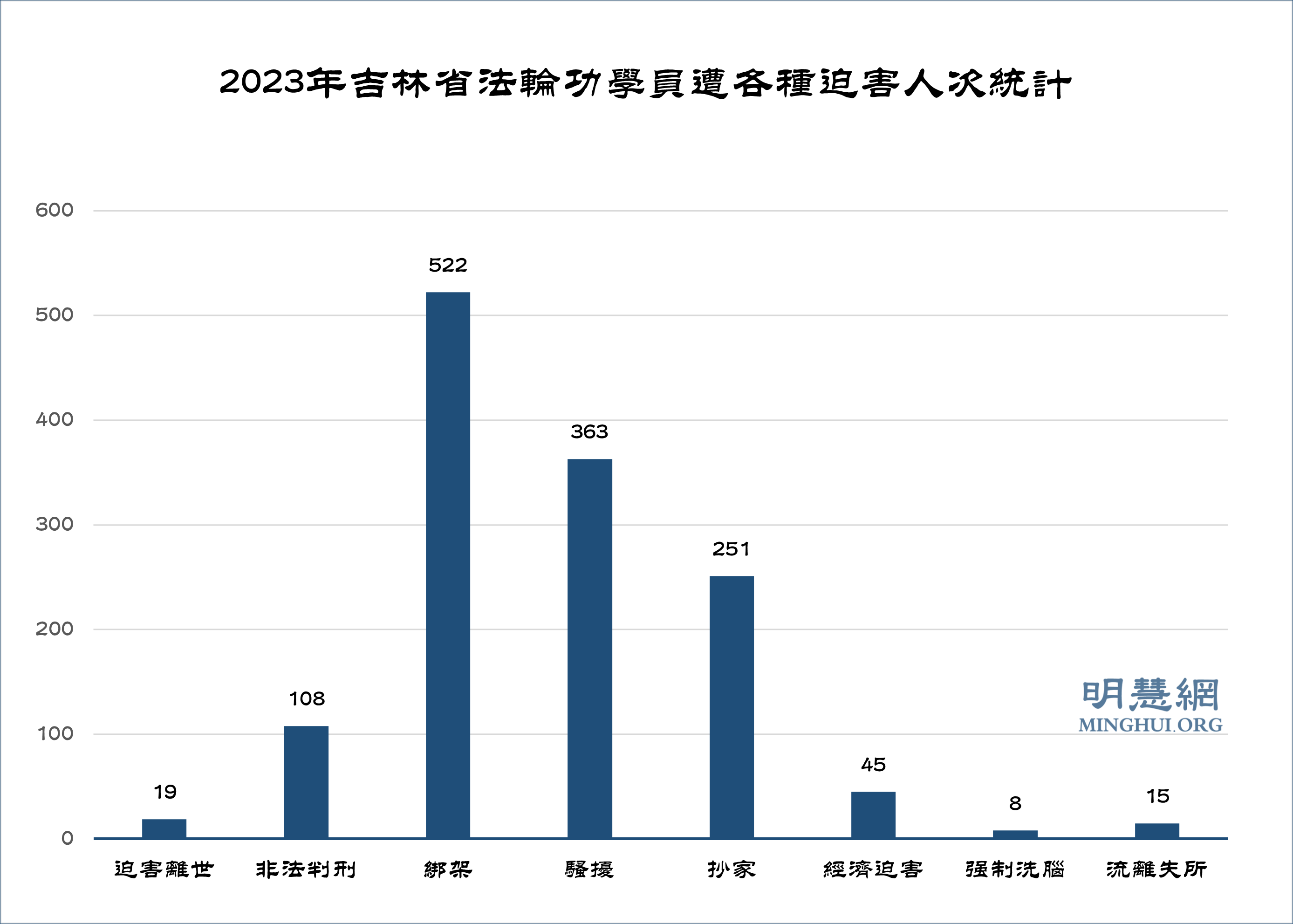 ![]() 图2:2023年吉林省法轮功学员遭各种迫害人次统计 |