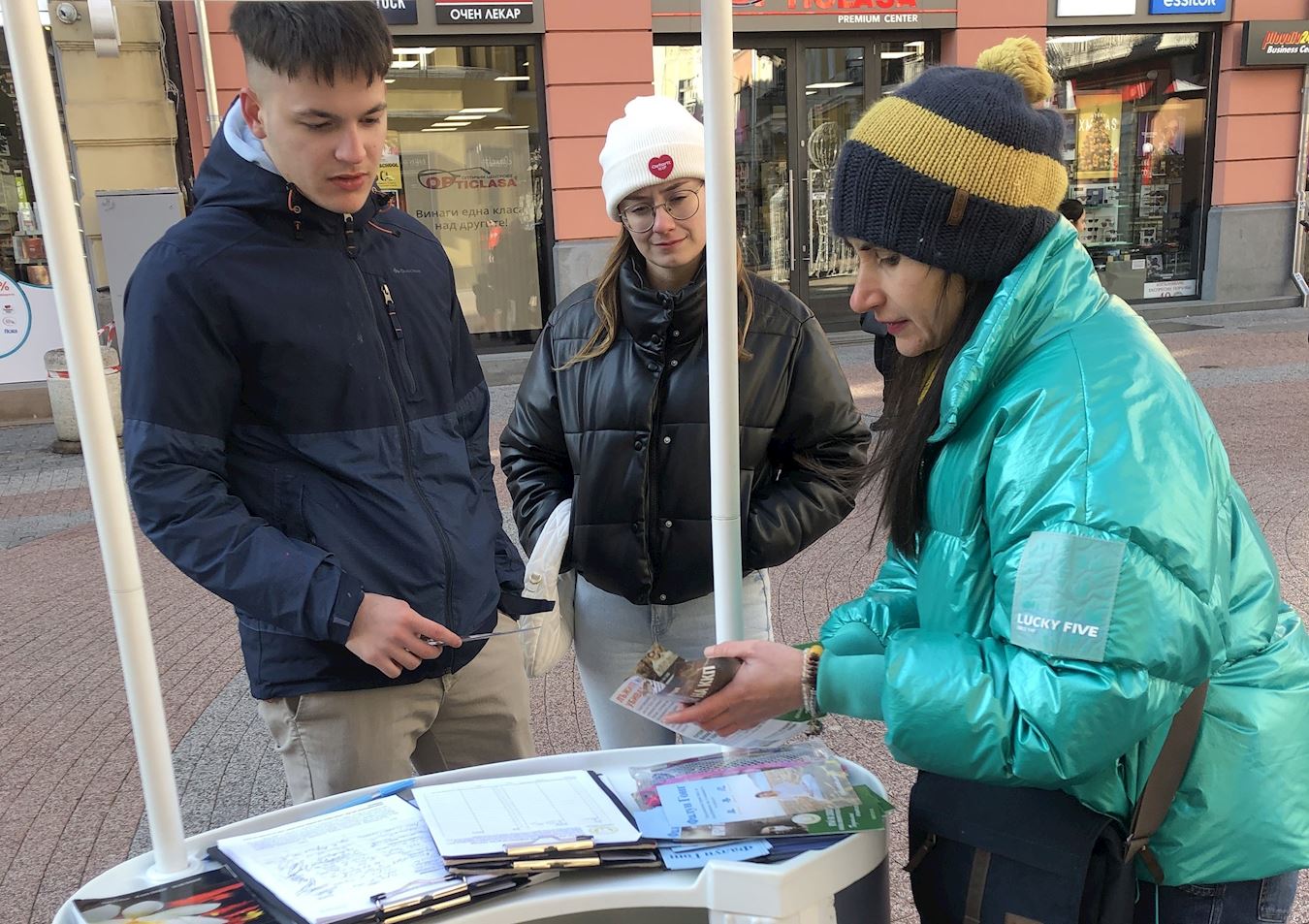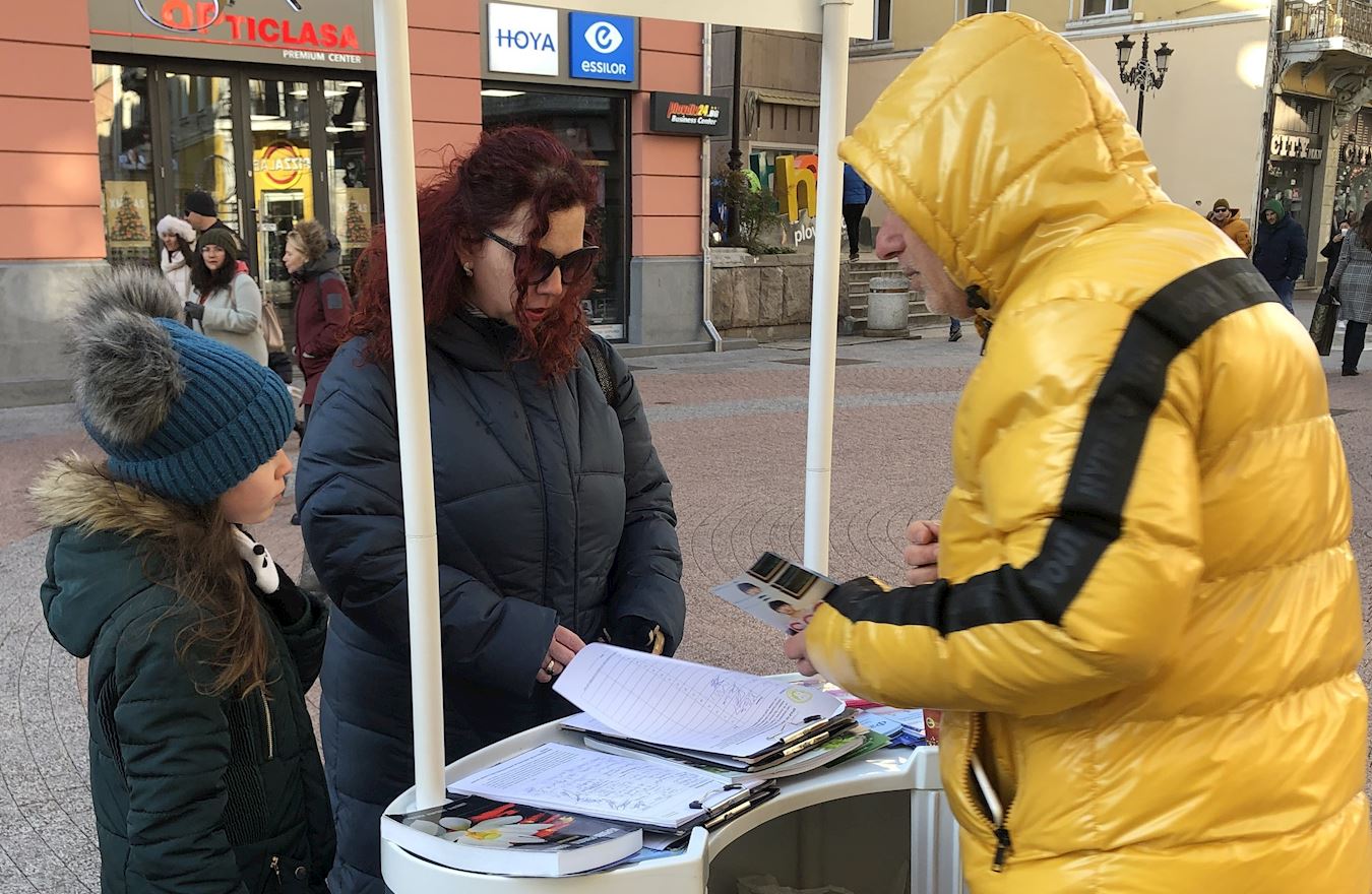 二零二四年一月十三日,来自普罗夫迪夫(Plovdiv)及周边城镇的法轮功学员们聚集在卡梅尼察楼梯前,举办新年第一次弘法活动。这里人流密集,很多行人主动停下来了解真相。