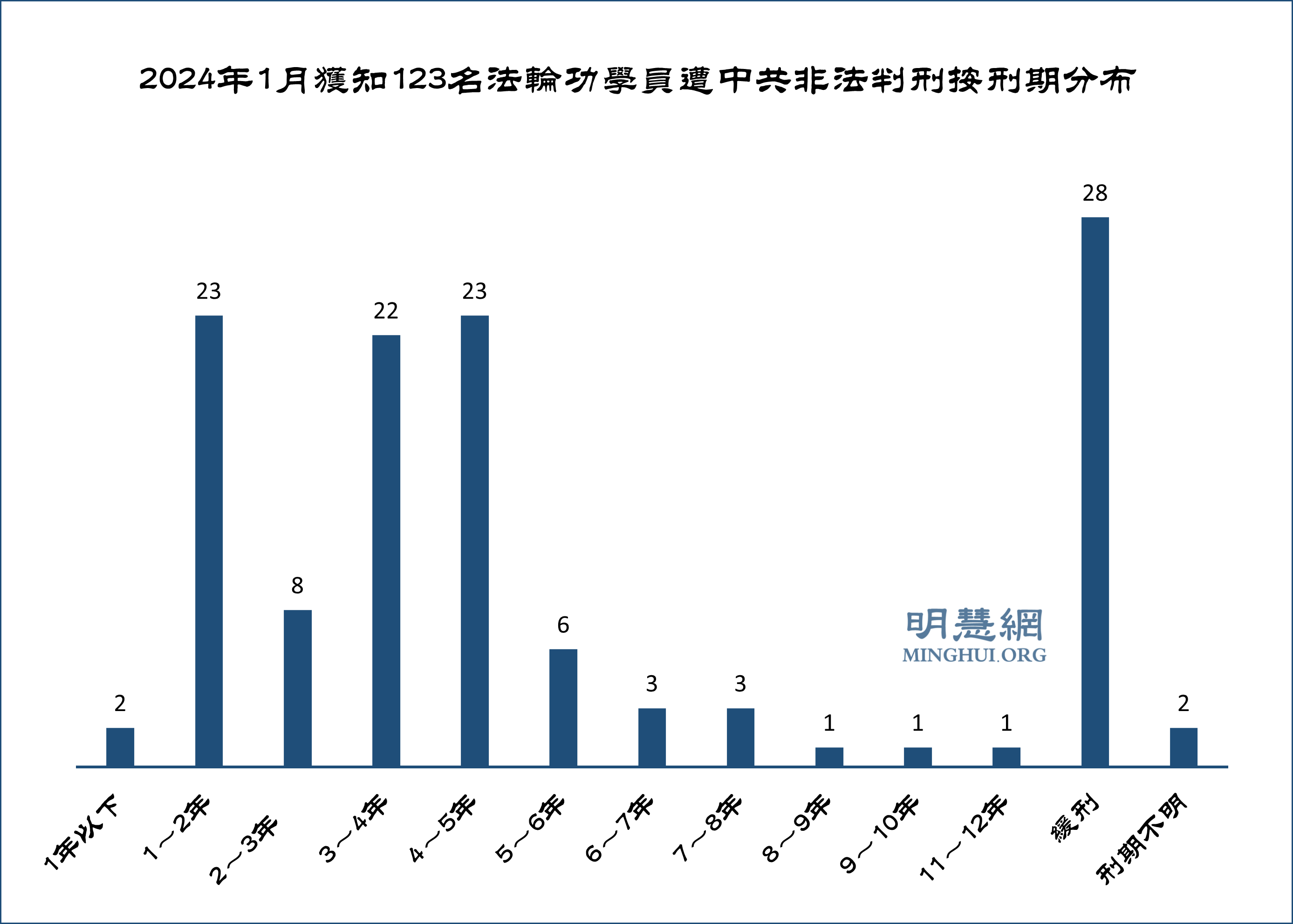 ![]() 图1:2024年1月获知123名法轮功学员遭中共非法判刑按刑期分布 |
