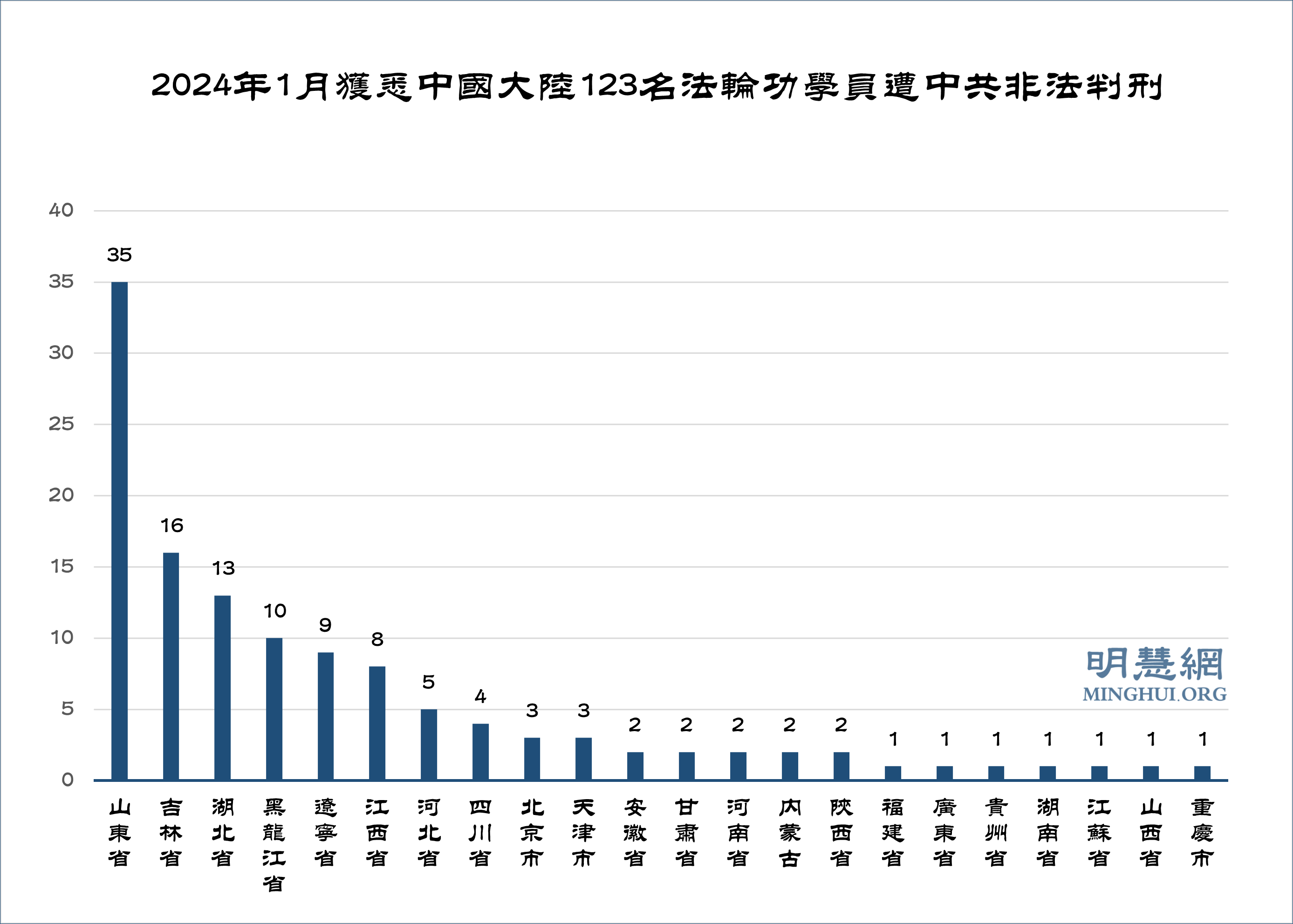 据明慧网报道统计,二零二四年一月份获知123名法轮功学员被非法判刑。非法判刑最严重地区为:山东省35人,吉林省16人,湖北省13人,黑龙江省10人,辽宁省9人,江西省8人。