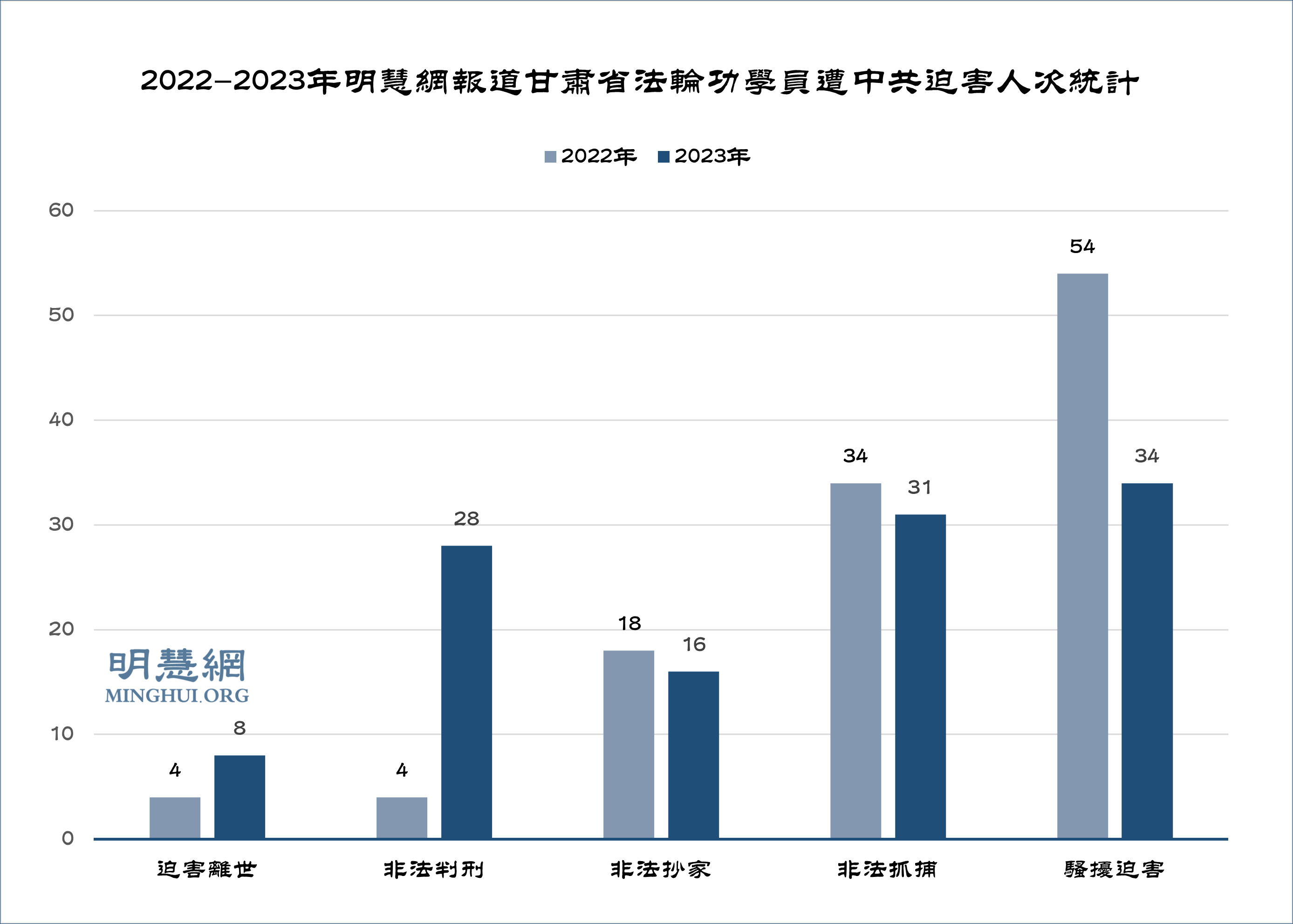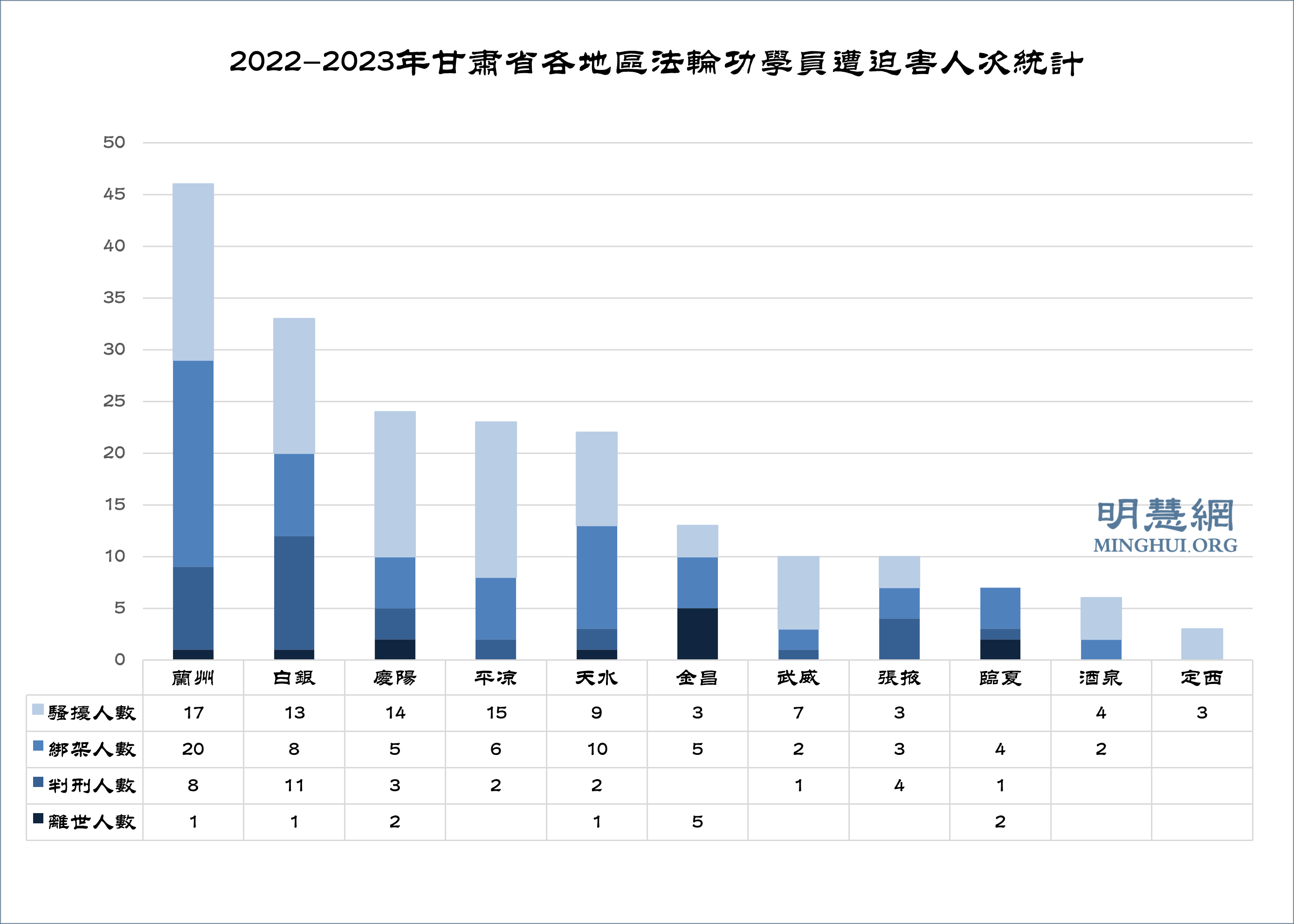 ![]() 图1:2022-2023年明慧网报道甘肃省法轮功学员遭中共迫害人次统计 |