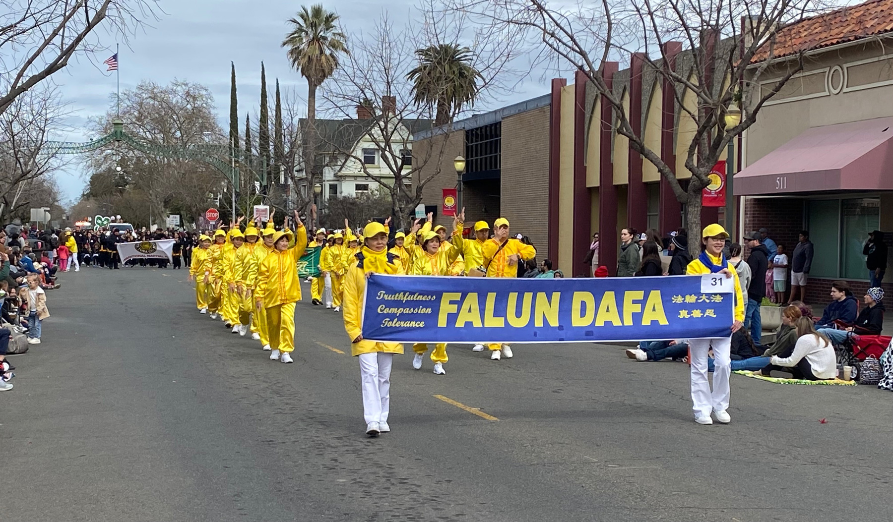 马里斯维尔市华埠也曾是早期华人淘金,修筑铁路和生存繁衍之地,被称为加州现存最古老的中国城。“北溪庙会”是由当地华人组织的敬神祈福、庆新年的活动,三月九日进行的游行活动是庙会的“重头戏”。身着金色炼功服的法轮功学员的炼功队,特别耀眼,成了游行中的一个亮点。