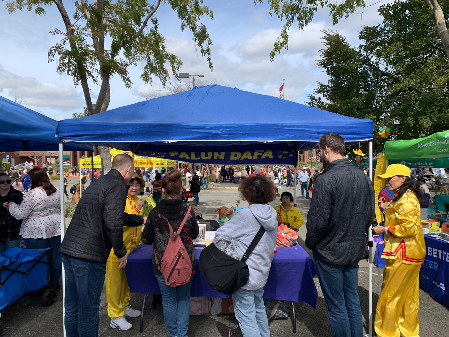 法轮功学员并在该庙会上设立了展位,提供现场免费教功与各种介绍法轮功的资料。不少人前来了解,有的驻足与学员交谈,有的表示想要学功或进一步了解大法真相的兴趣;有的当即要买书,其中有好些大陆来的华人开心地接受了介绍法轮大法的真相资料。一位华人走上来就想学功,还要帮自己的同胞多拿几张介绍大法的资料。他表示了解法轮功遭迫害的真相,说:“我都知道。我经常看你们的媒体节目。”