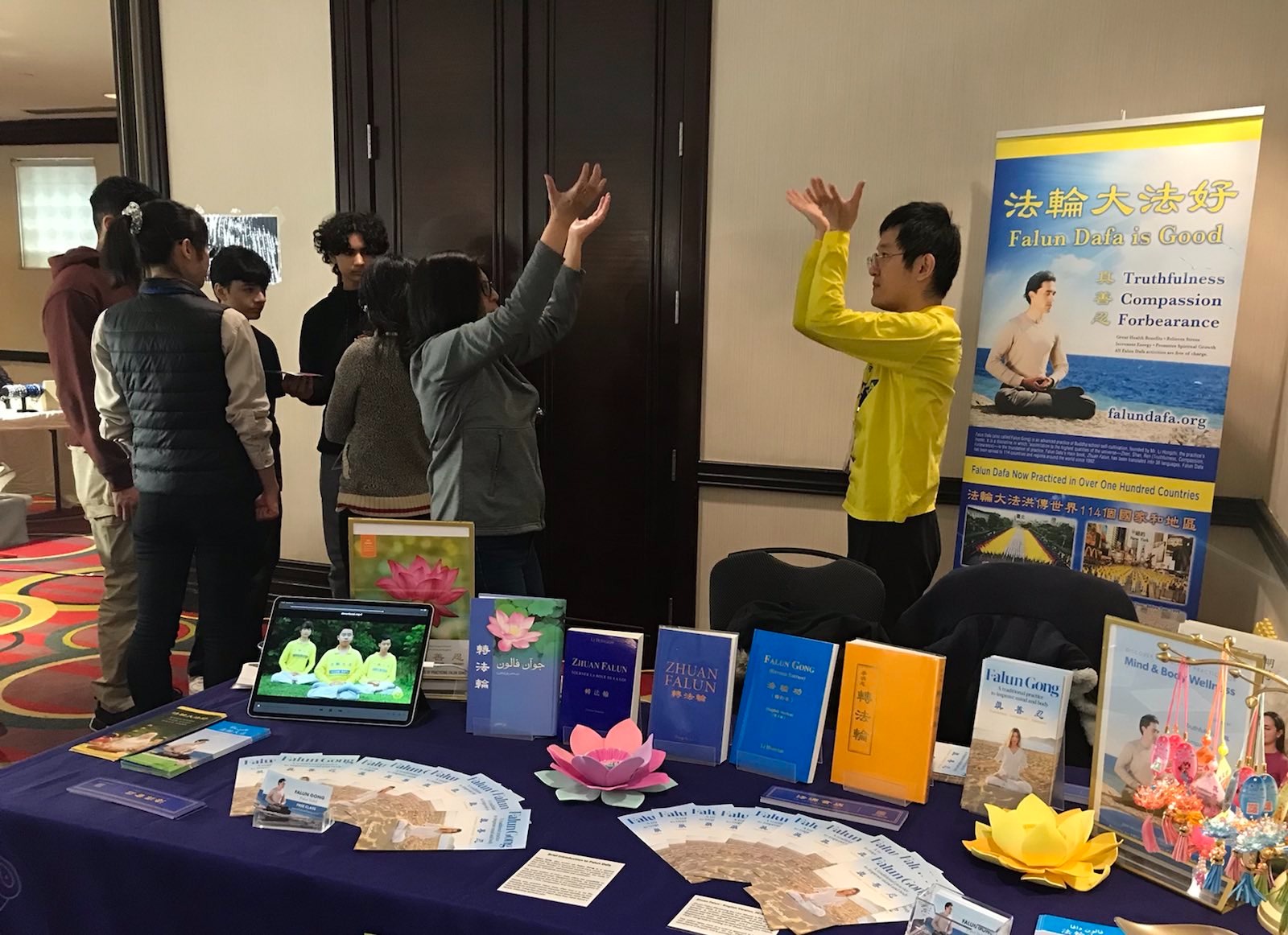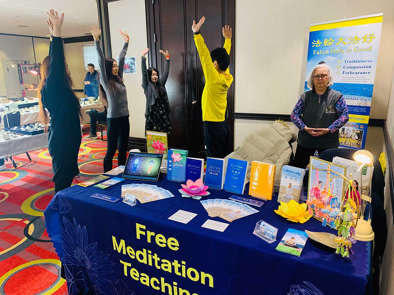 在法轮大法的展位上,展览了中英文及其它文种的《转法轮》书籍、明慧国际杂志和功法的介绍资料。来展位了解功法的观众纷纷现场学炼了五套功法,亲身感受了炼功带来的身体变化;也有观众听到学员讲述家人因修炼法轮大法而被中共迫害,不禁感伤落泪;有观众接到传单后,回忆起曾经到大法展位学炼过功法;也有观众在了解法轮功能帮他们获得平静的心灵和健康的身体,便不停询问,想要得到更多信息;有观众说自己购买了大法书籍,已经开始阅读了。