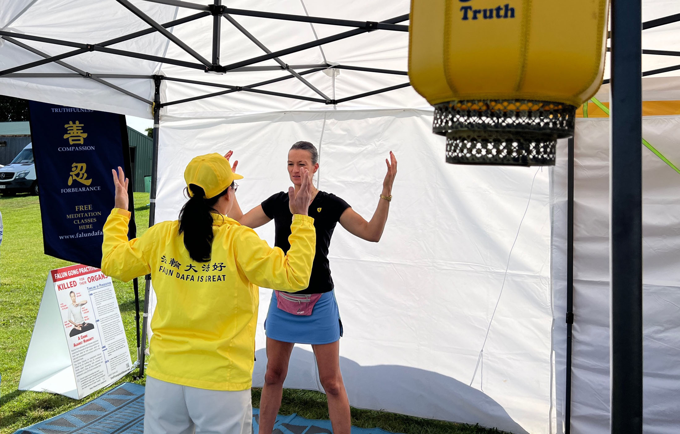 卡塔琳娜 (Katharina)是在法轮功学员摊位对面的摊主。在看了法轮功学员的功法演示后,她来到了摊位前学炼功法。