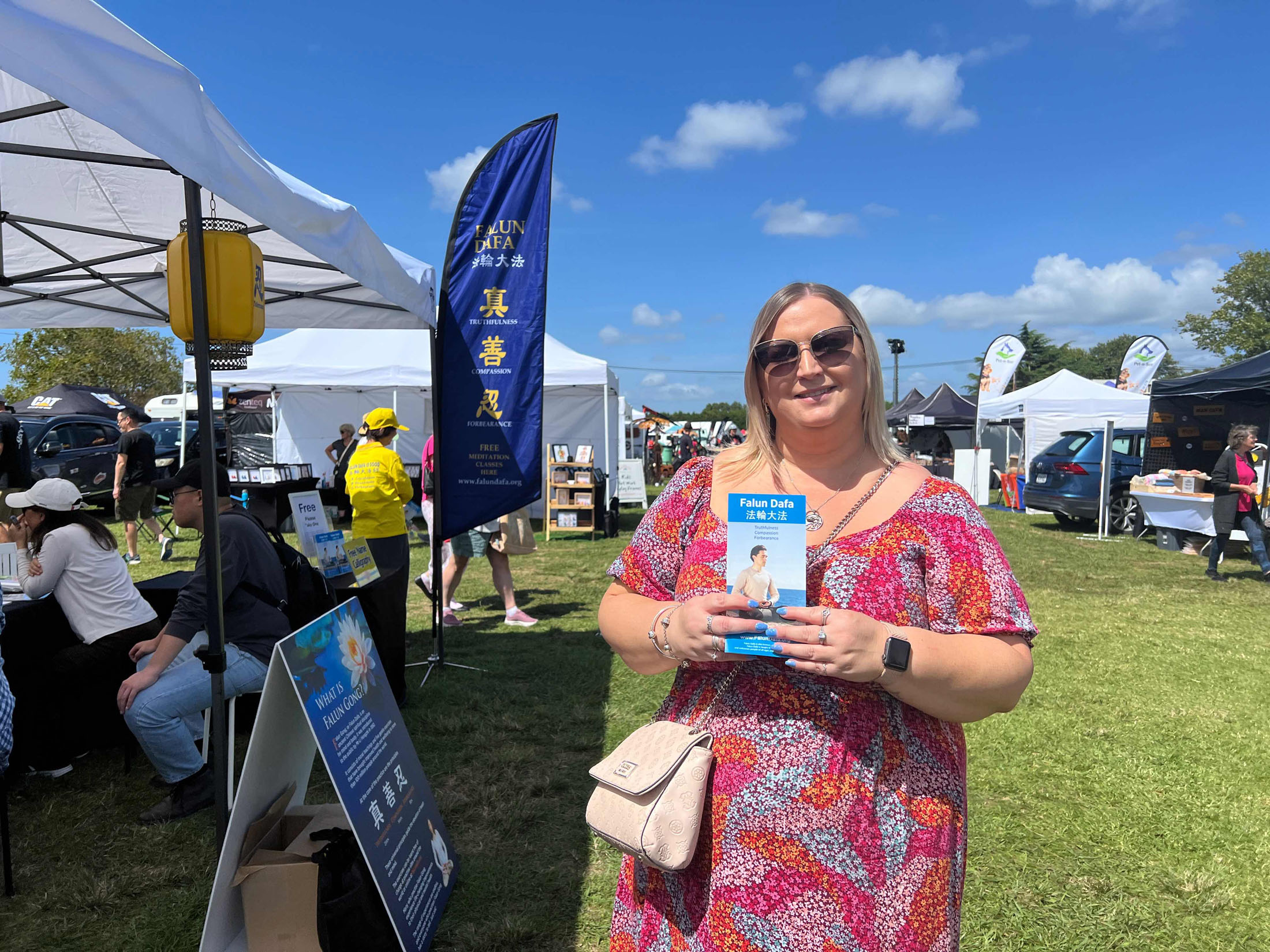 一位华人女士在摊位前驻足并主动与法轮功学员交谈。她跟学员讲述了她曾经与大法结缘的故事:“有一个跟我关系很好的同事炼法轮功,她被(中共)抓进去过,工资也被停了,也没放弃(修炼)。我当时就想,我同事这么个好人,怎么会得到这种待遇呢?”