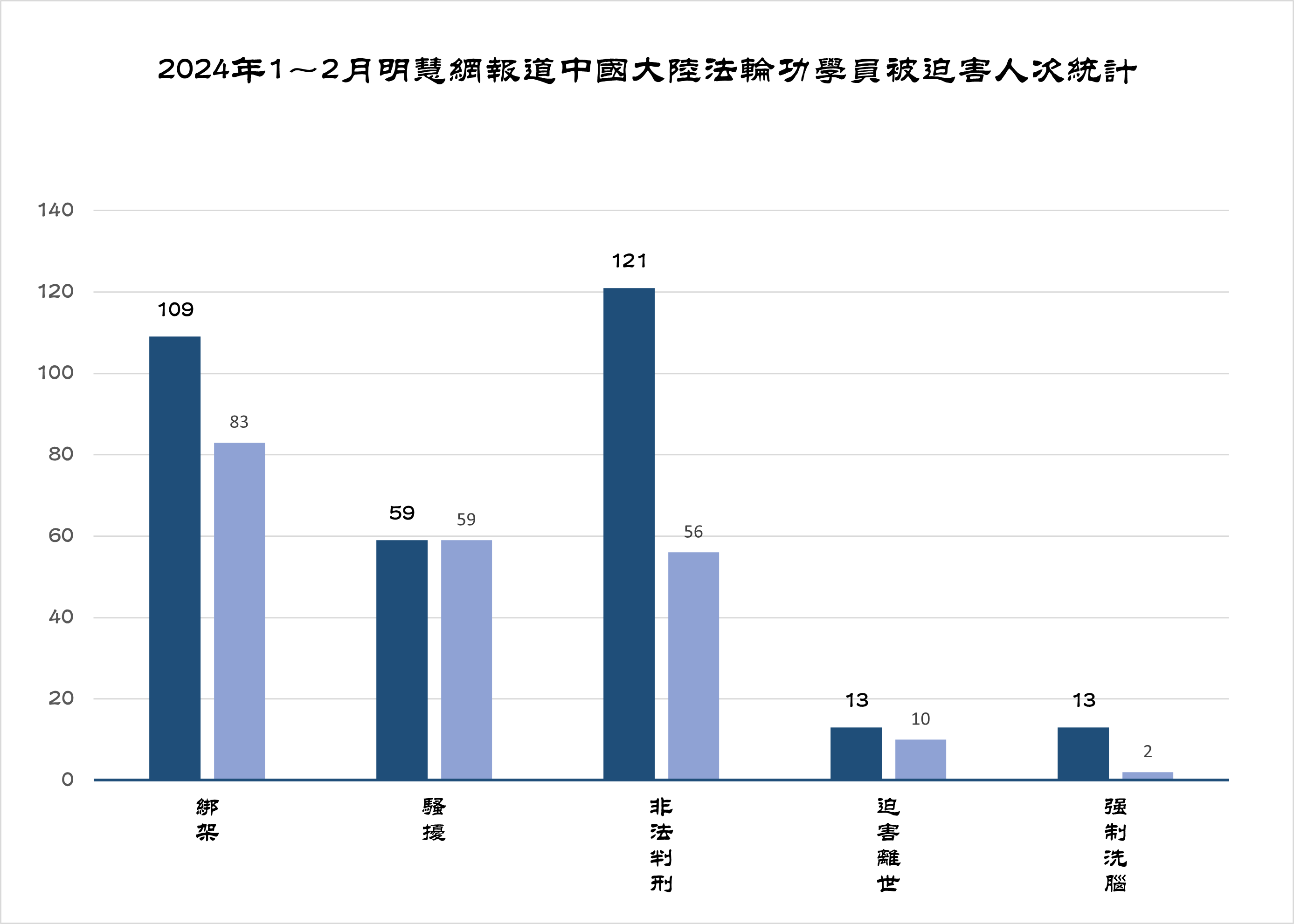 ![]() 图1:2024年1~2月明慧网报道中国大陆法轮功学员被迫害人次统计 |